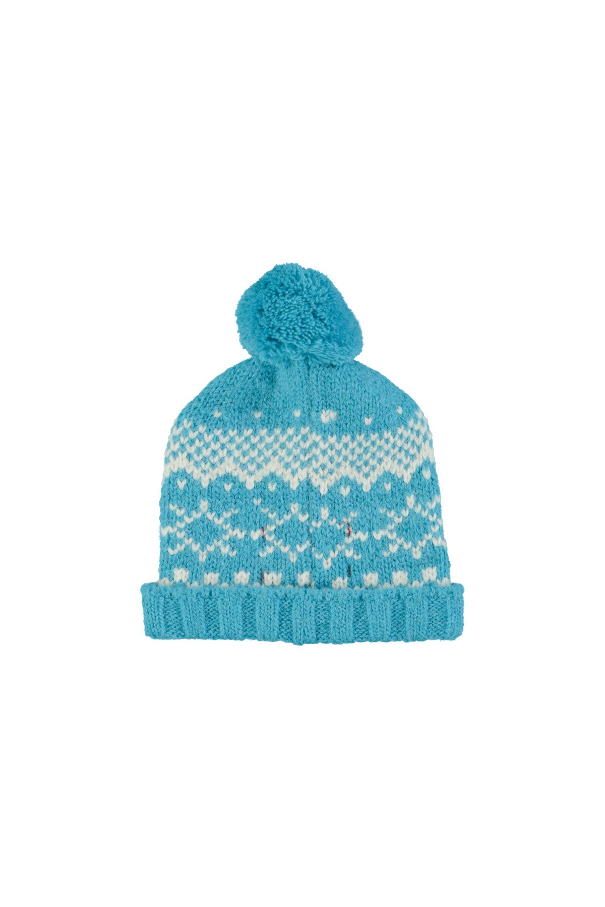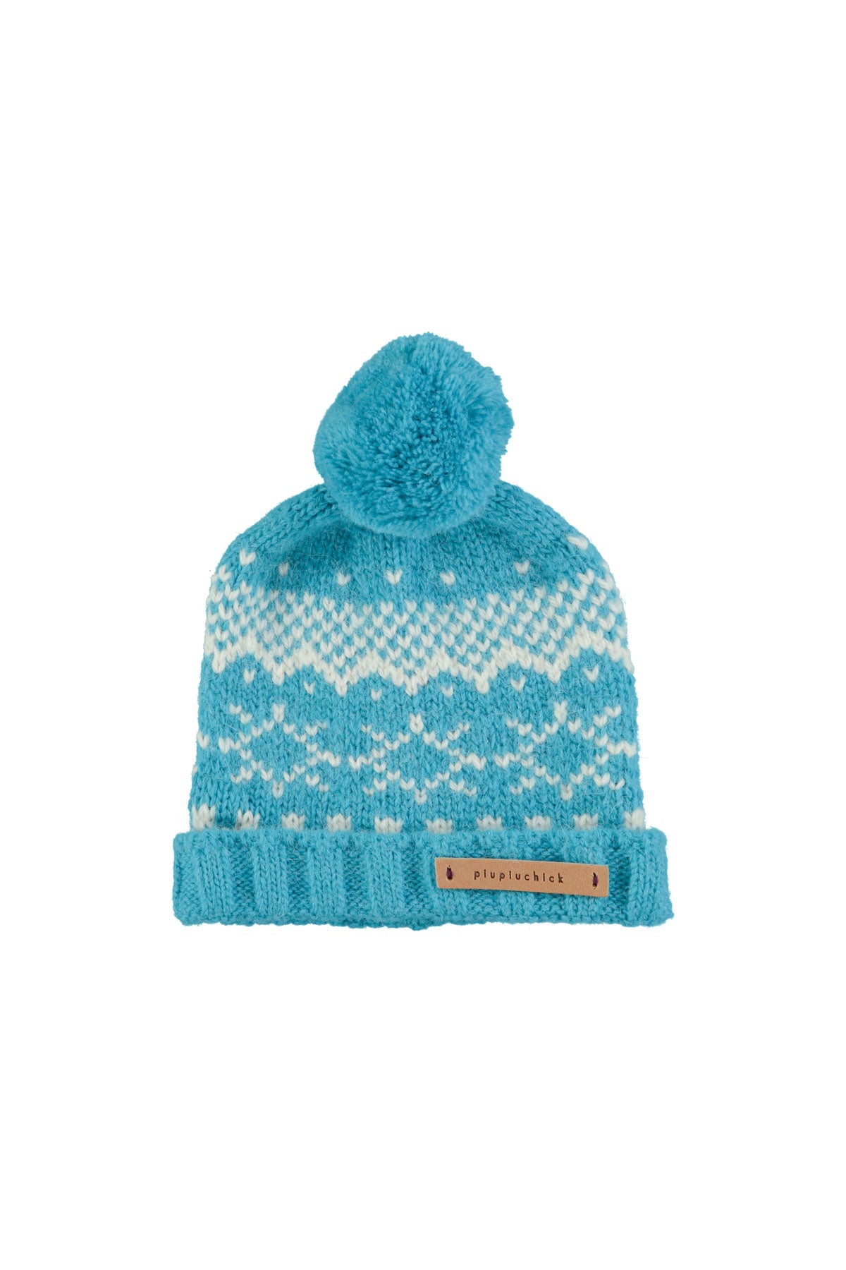 Knitted hat with jacquard detail and pompon. Detailed with leather label.
