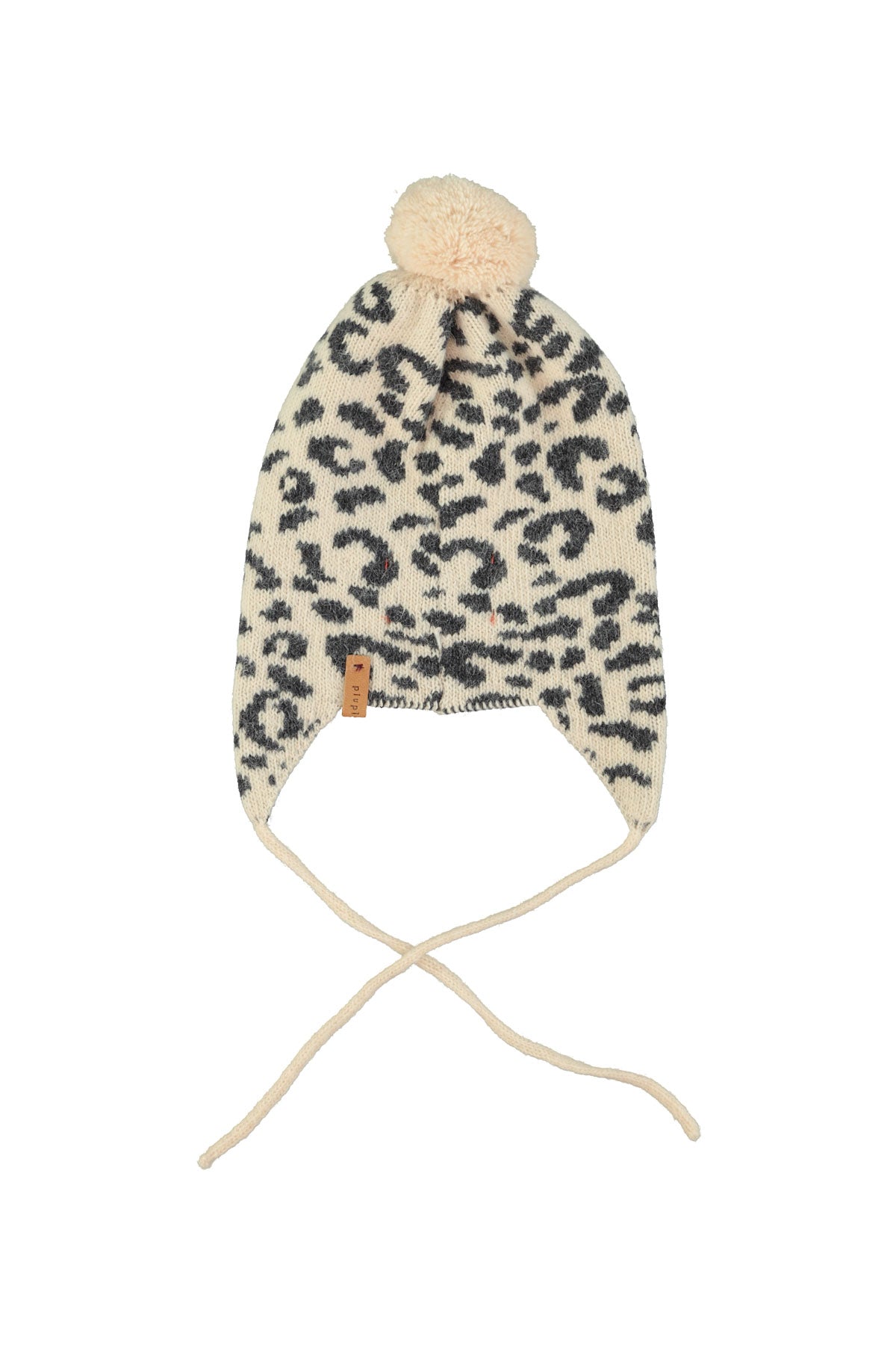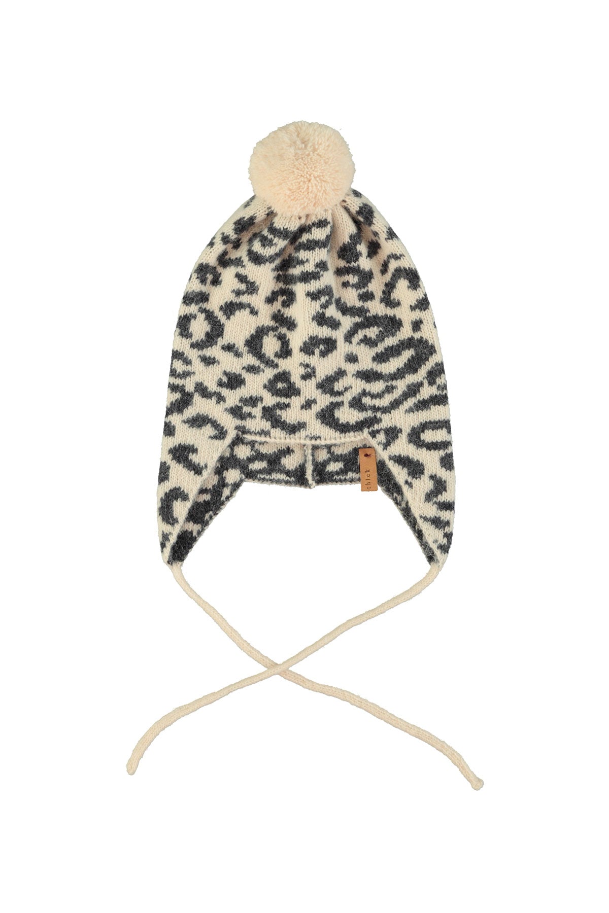 Knitted baby hat with pompom, ear flaps and detailed with leather logo label.