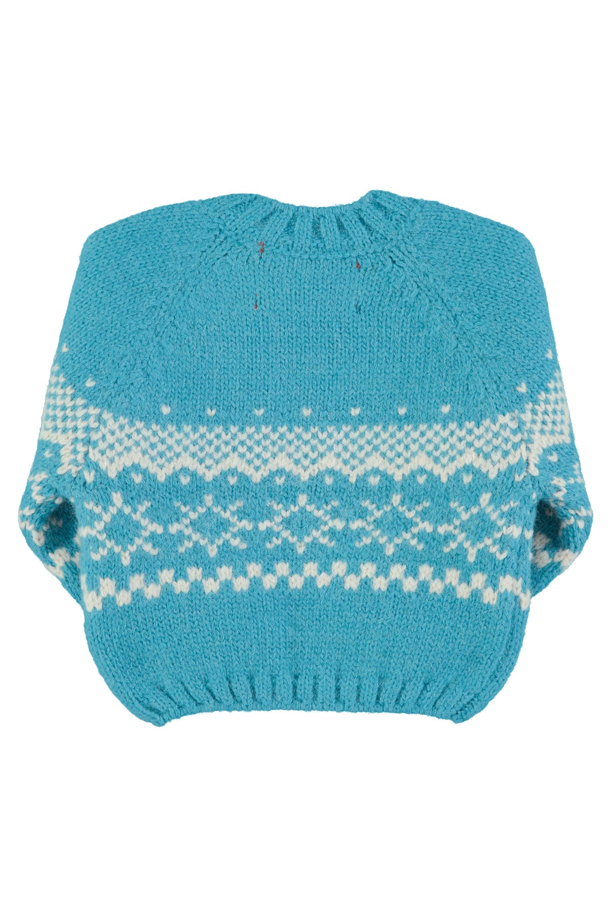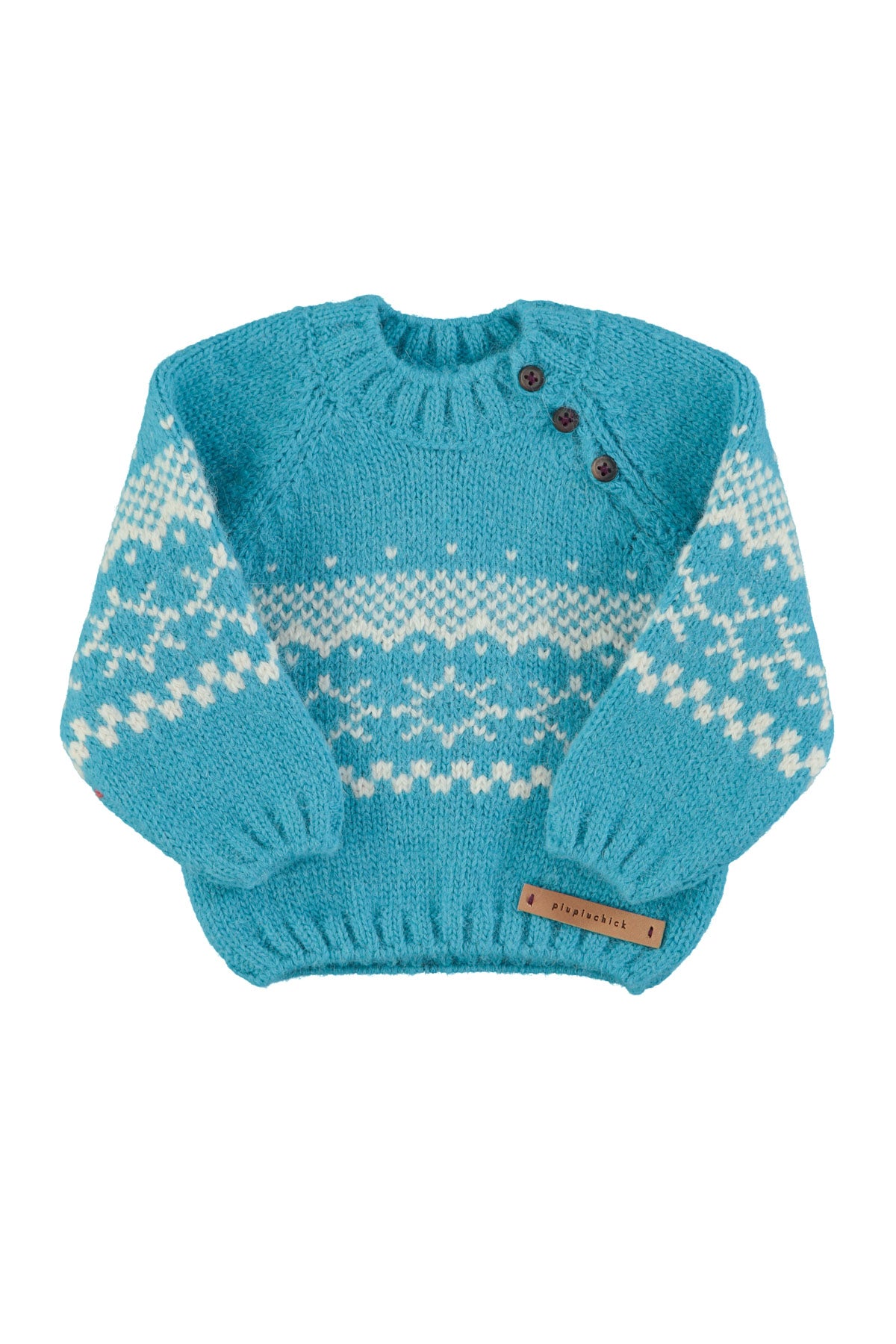 Knitted sweater with jacquard detail. Baby sizes have buttons on the shoulder. Detailed with leather logo label