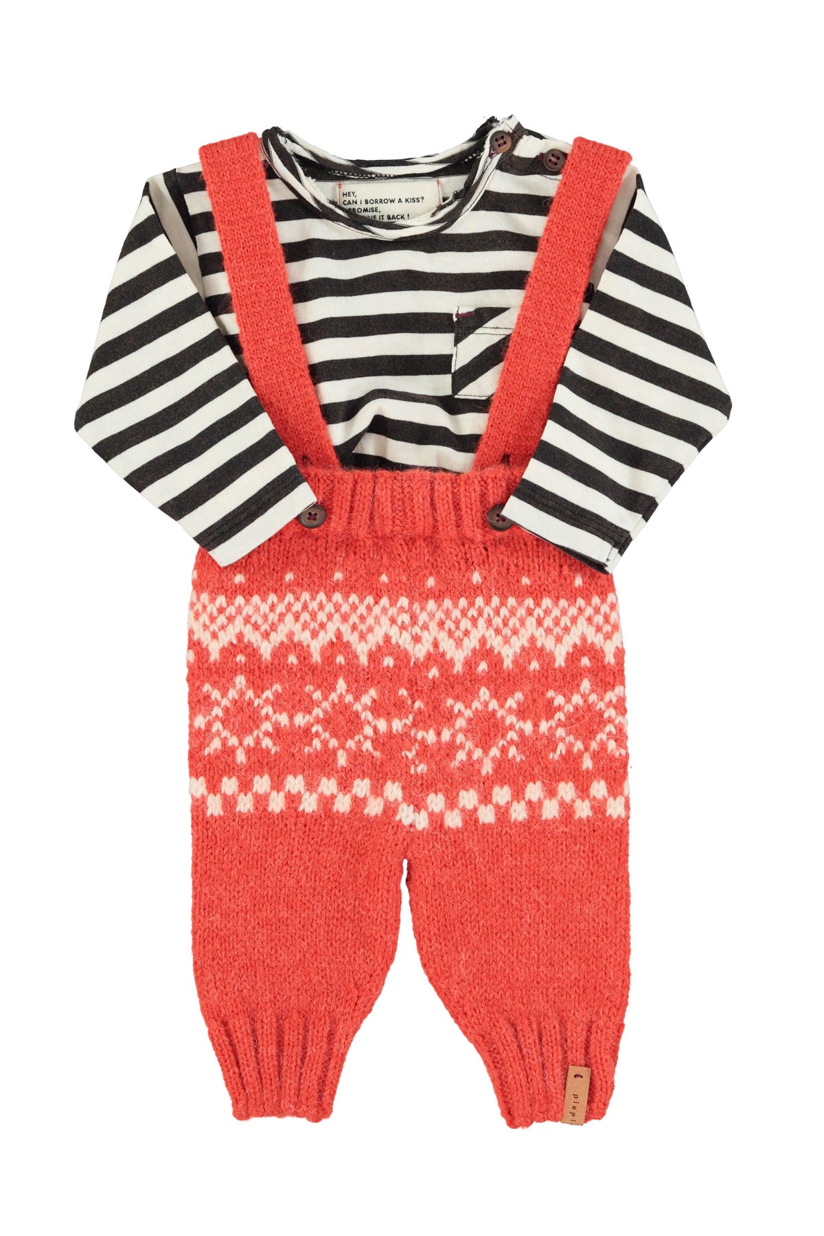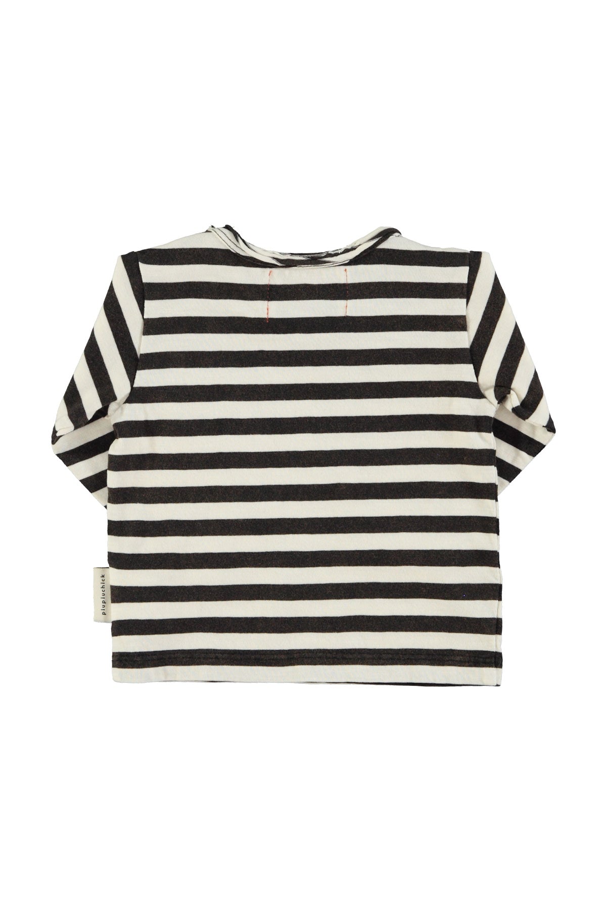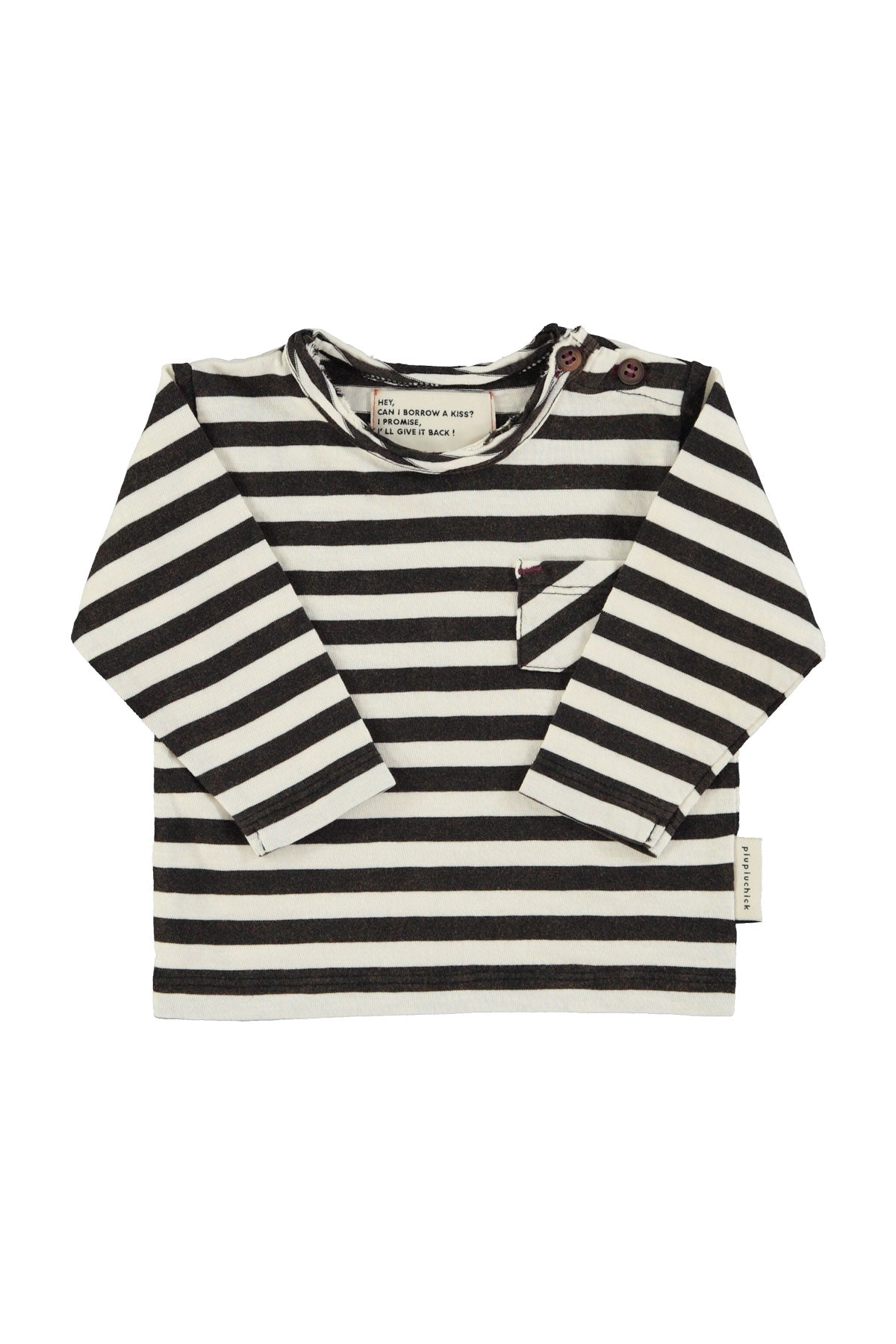 Long sleeve with round collar and pocket on chest. Detailed with multicolor circles front print and text print on the back. Wood buttons on shoulder for baby sizes.