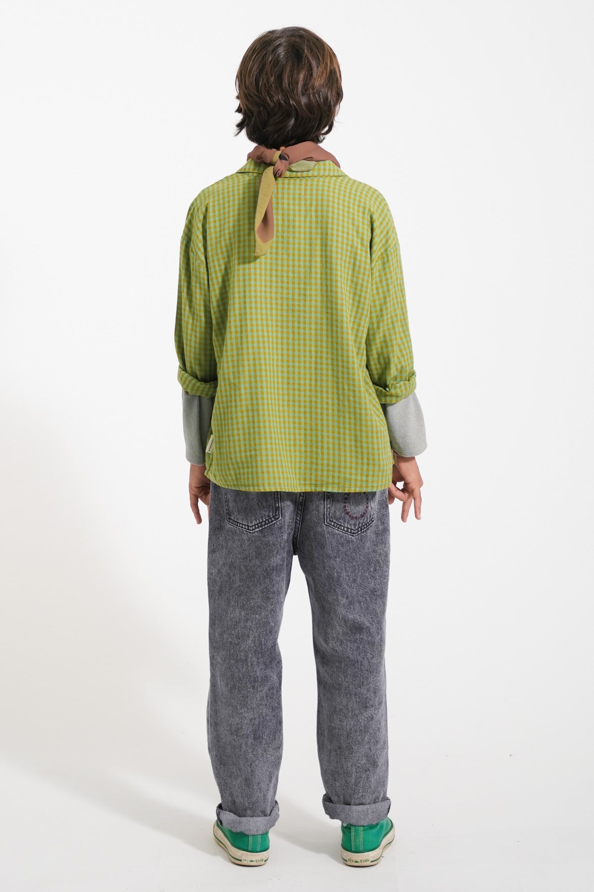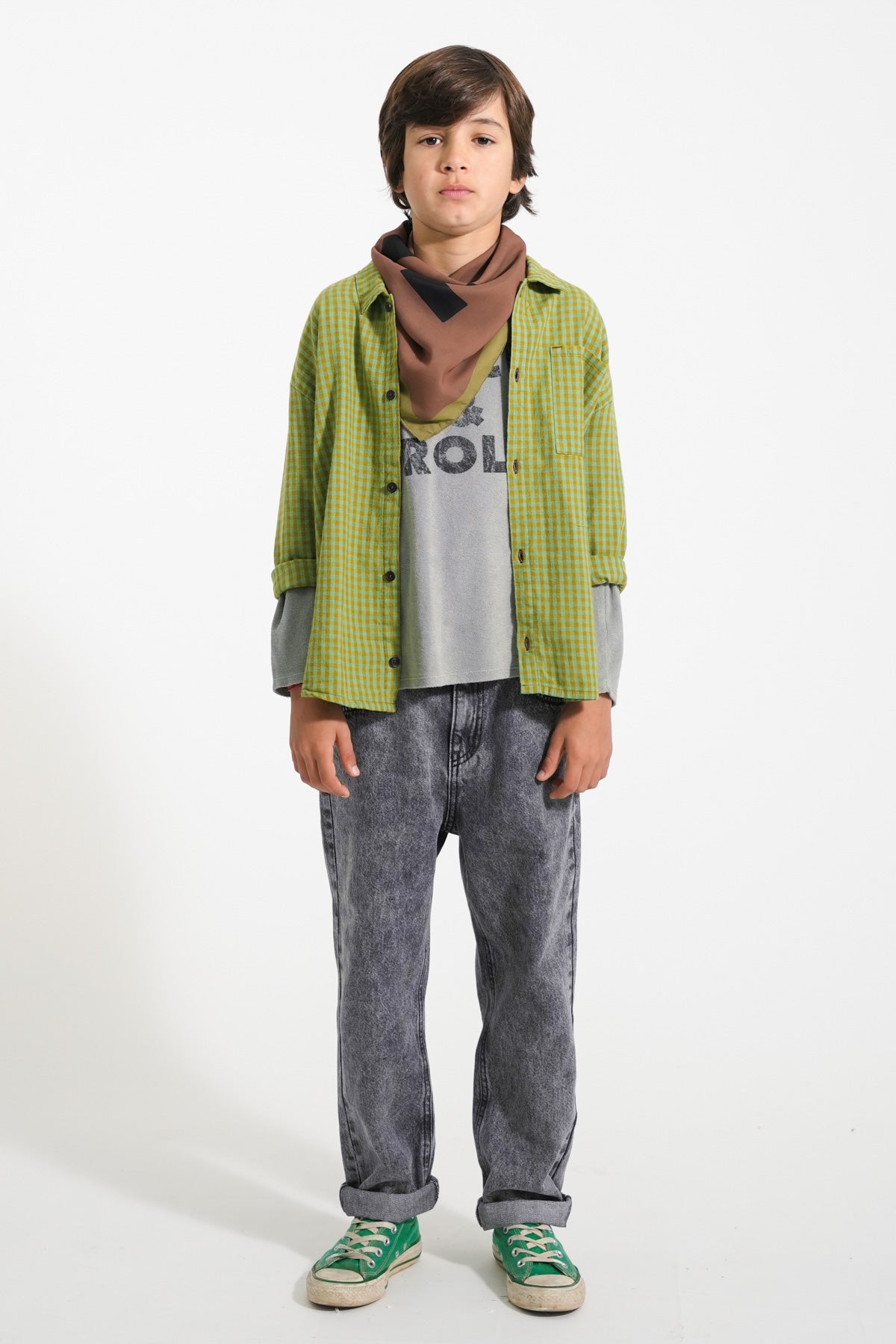 Long sleeve in terry cotton with round collar and pocket on chest. Detailed with front and back print. Buttons on shoulder for baby sizes.