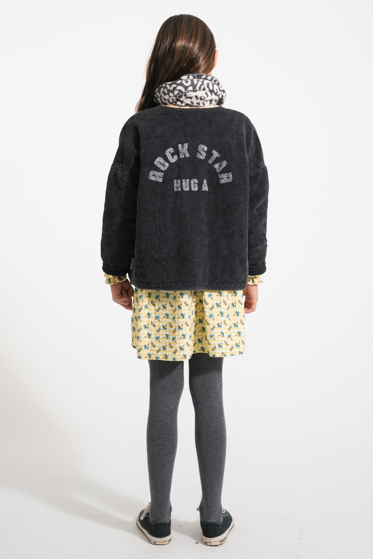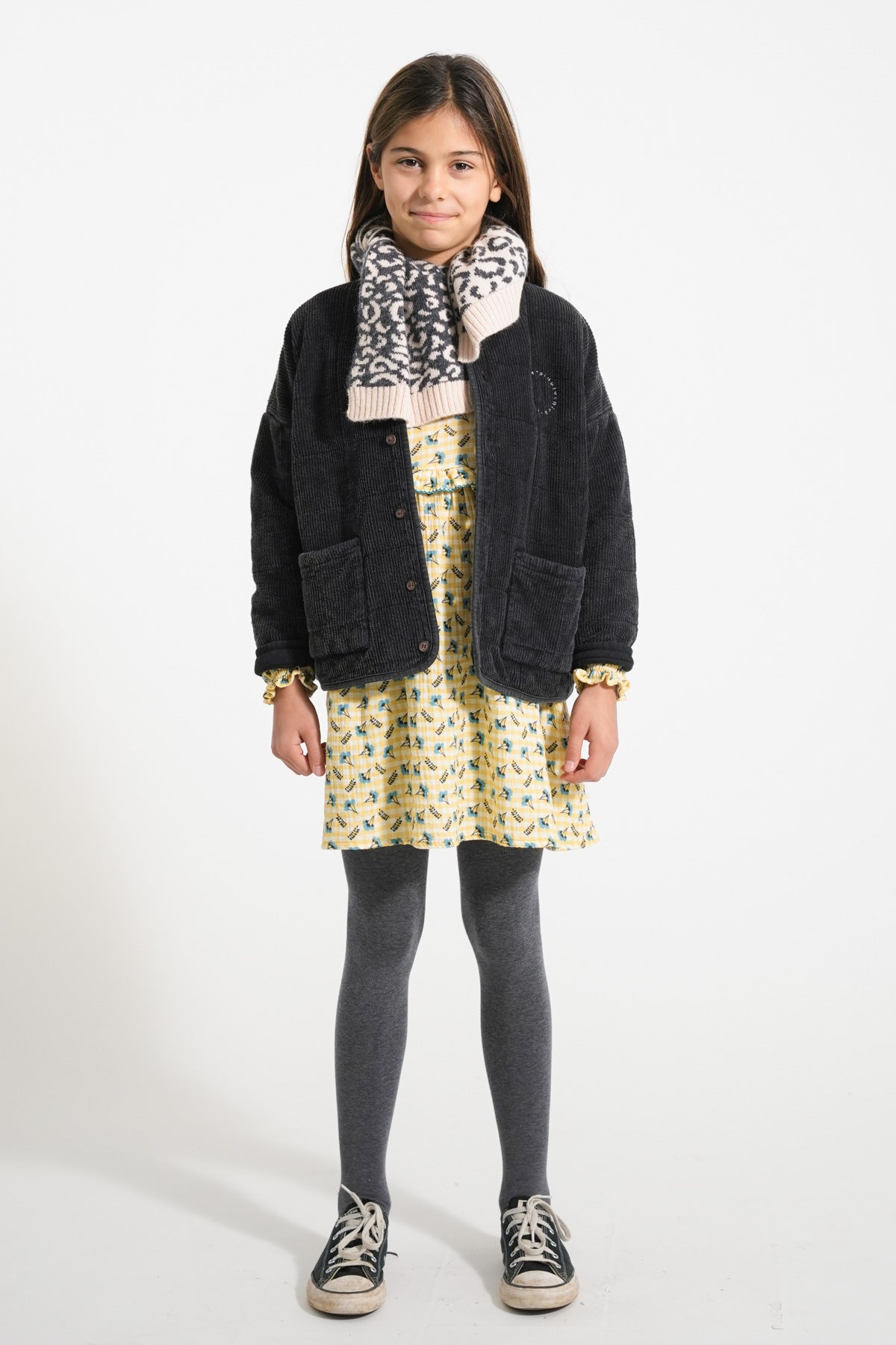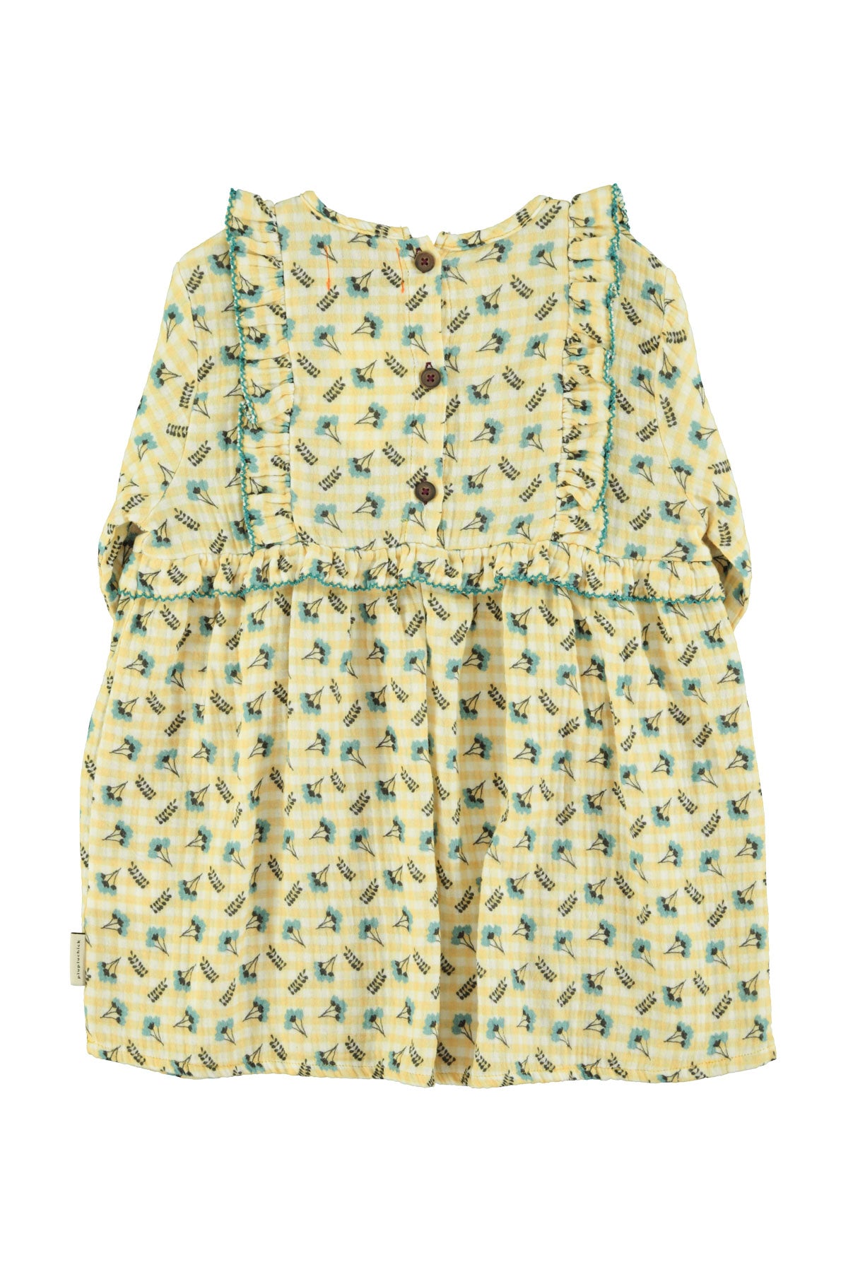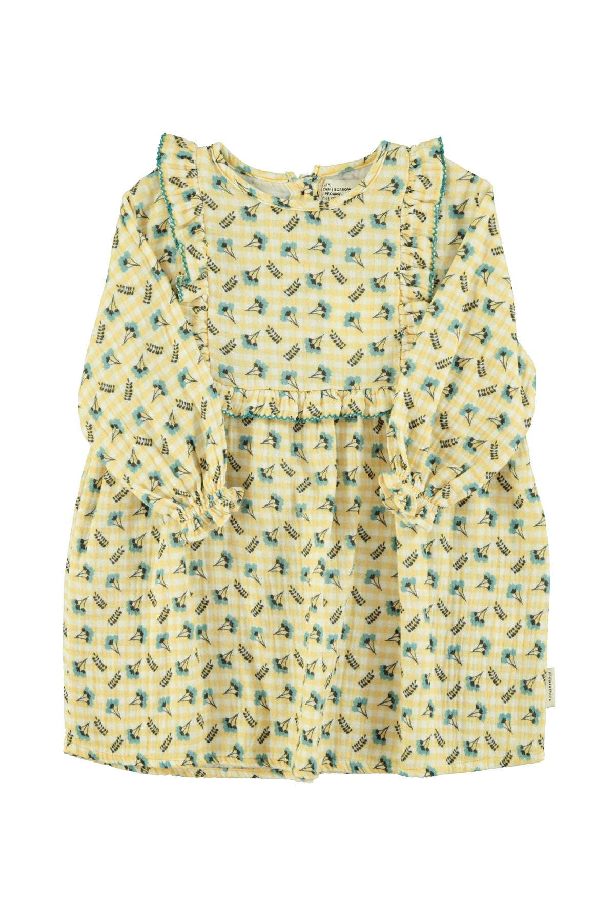 Short dress with ruffles on shoulders, chest and back, detailed with blue embrodery. Buttons on the back. Elasticated cuffs.