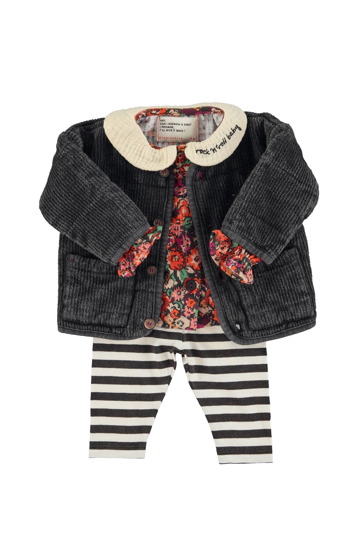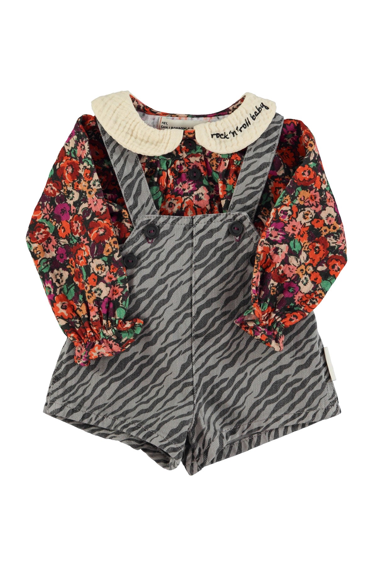 Baby Blouse with ecru peter pan collar detailed with "rock'n'roll baby" embroidery. Buttons on the front. Elasticated cuffs. Frilled yoke.
