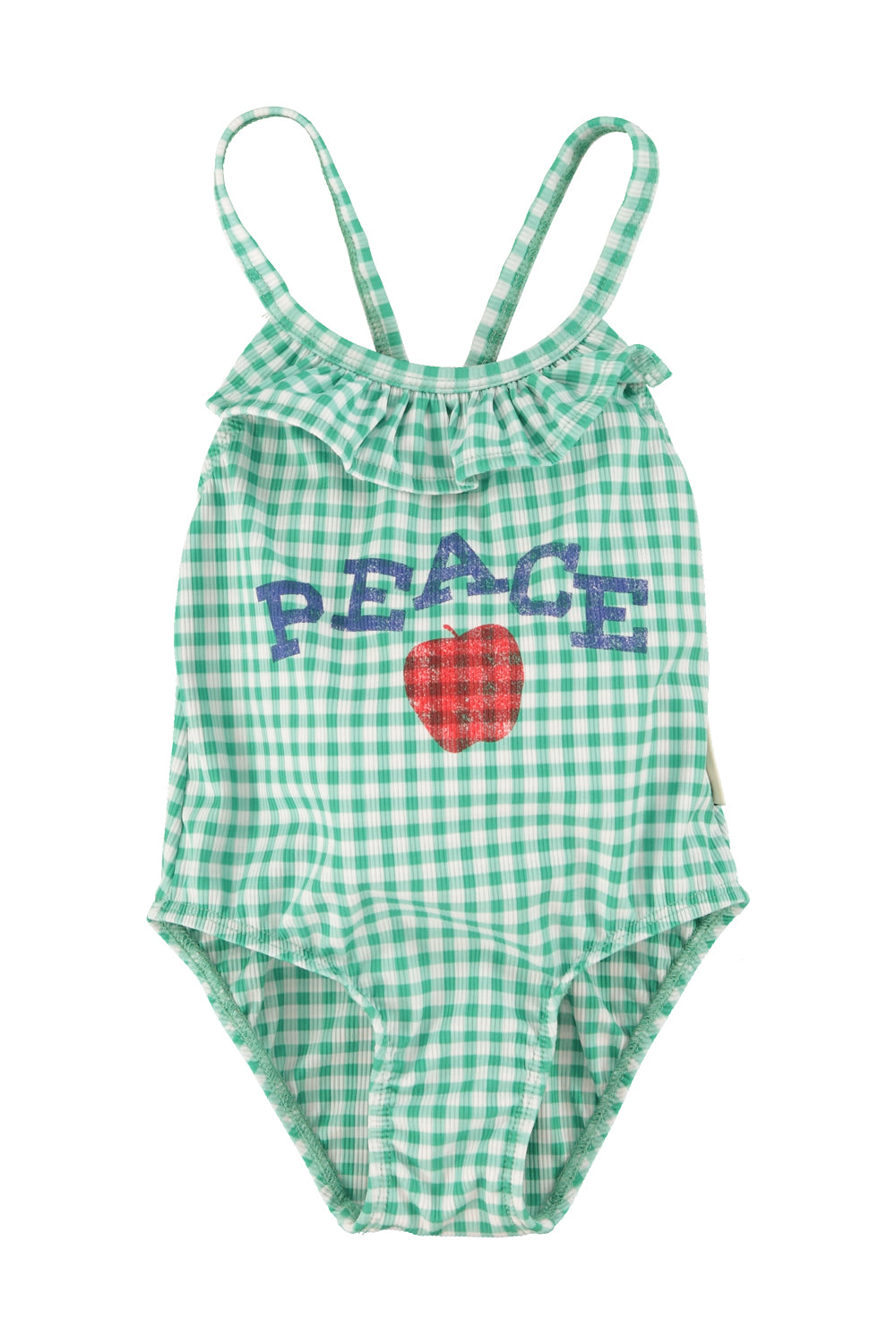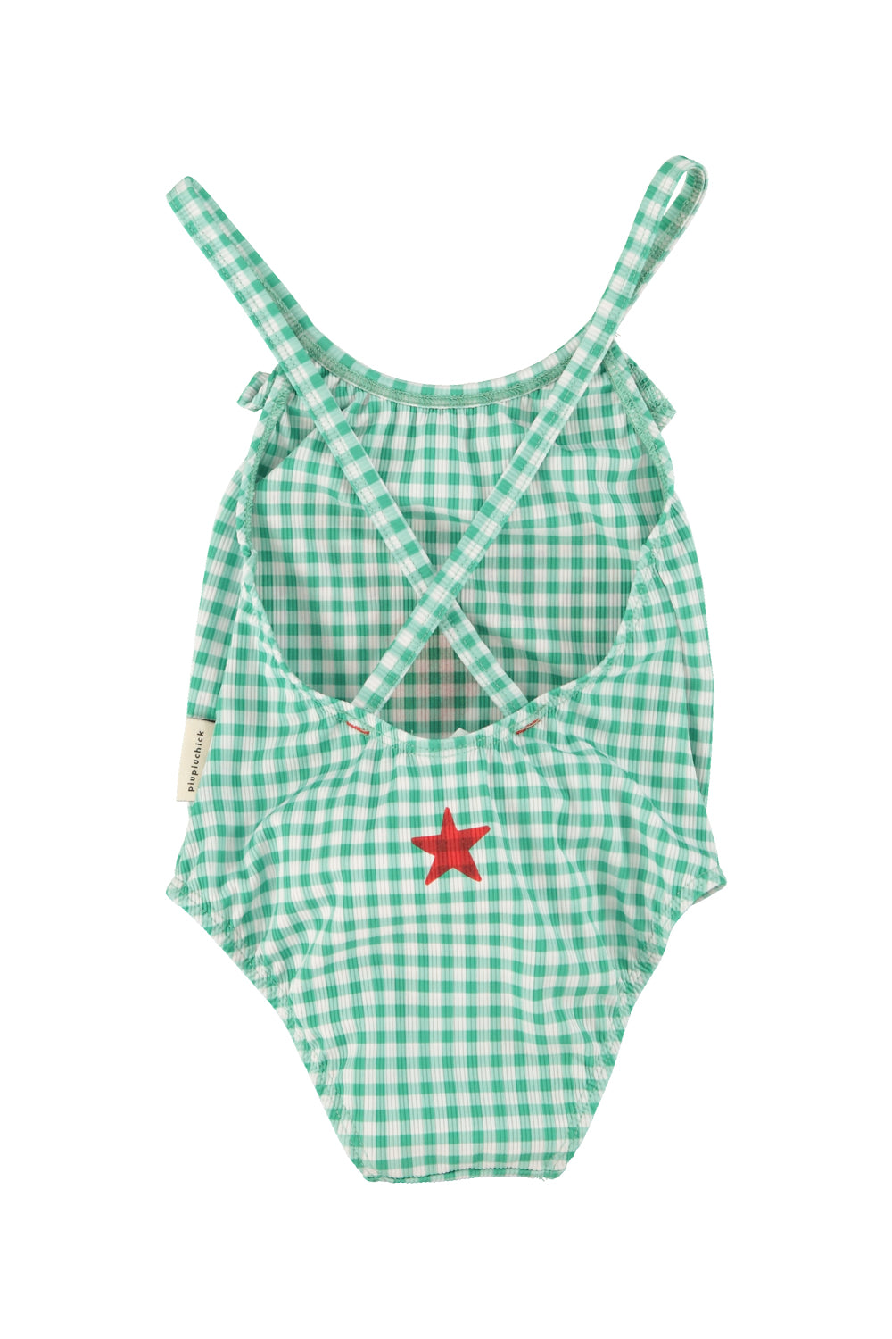 Swimsuit with thin straps. Ruffle on chest and front print. Crossed thin straps on the back. Detailed with red star logo on the back.