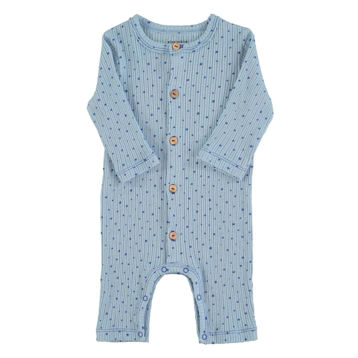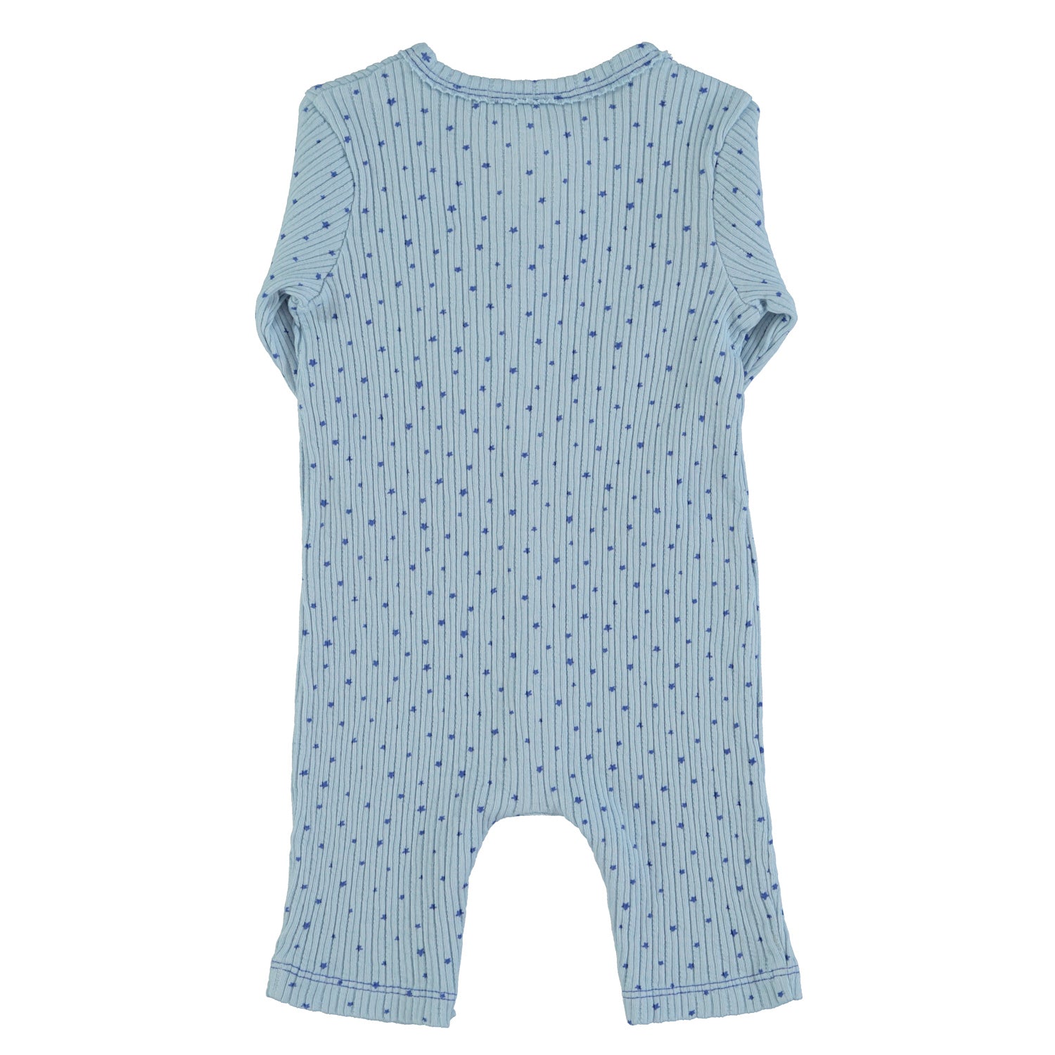 Newborn long sleeve babygrow in ribbed jersey. Press-studs at the legs for easy opening. Detailed with wood buttons on the front.