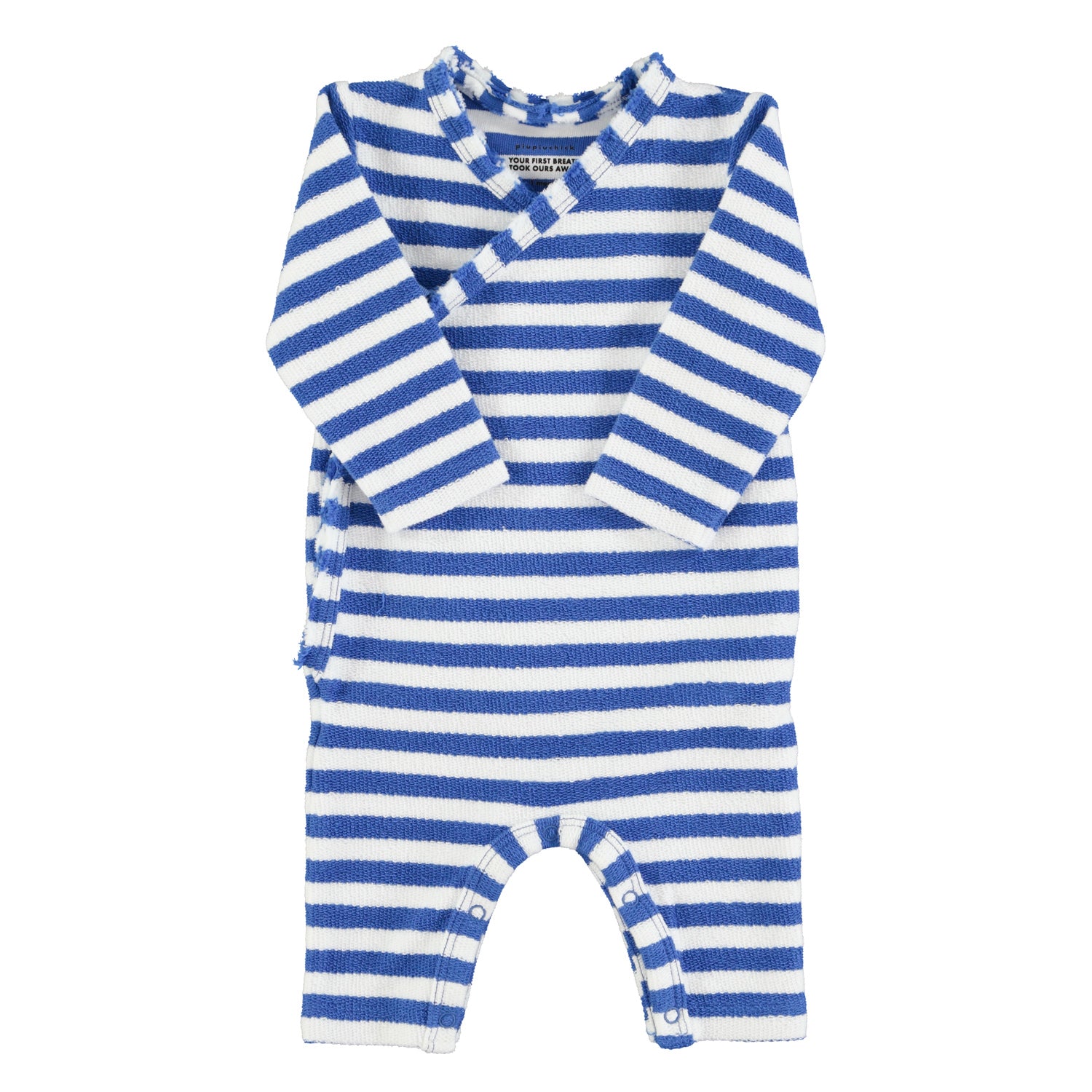 Newborn long sleeve babygrow in organic cotton fleece. Crossover neckline with a small ribbon to adjust. Press-studs at the legs for easy opening.