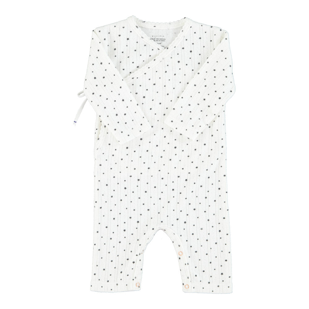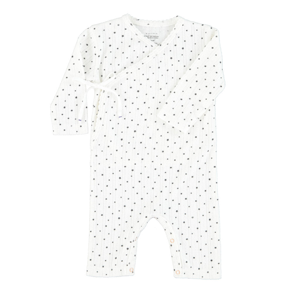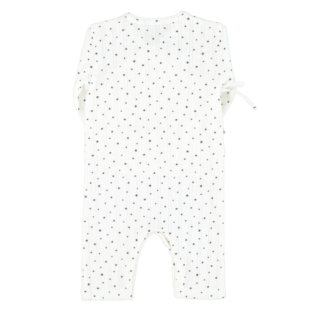 Newborn longsleeve babygrow in ribbed jacquard. Crossover neckline with a small ribbon to adjust. Press-studs at the legs for easy opening. opening.