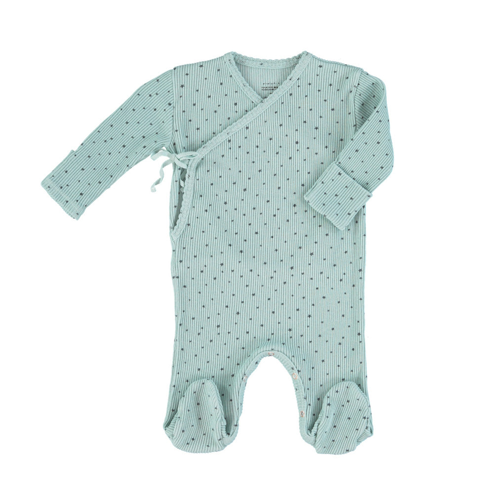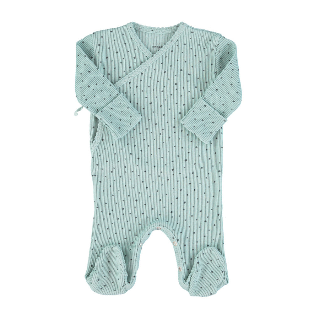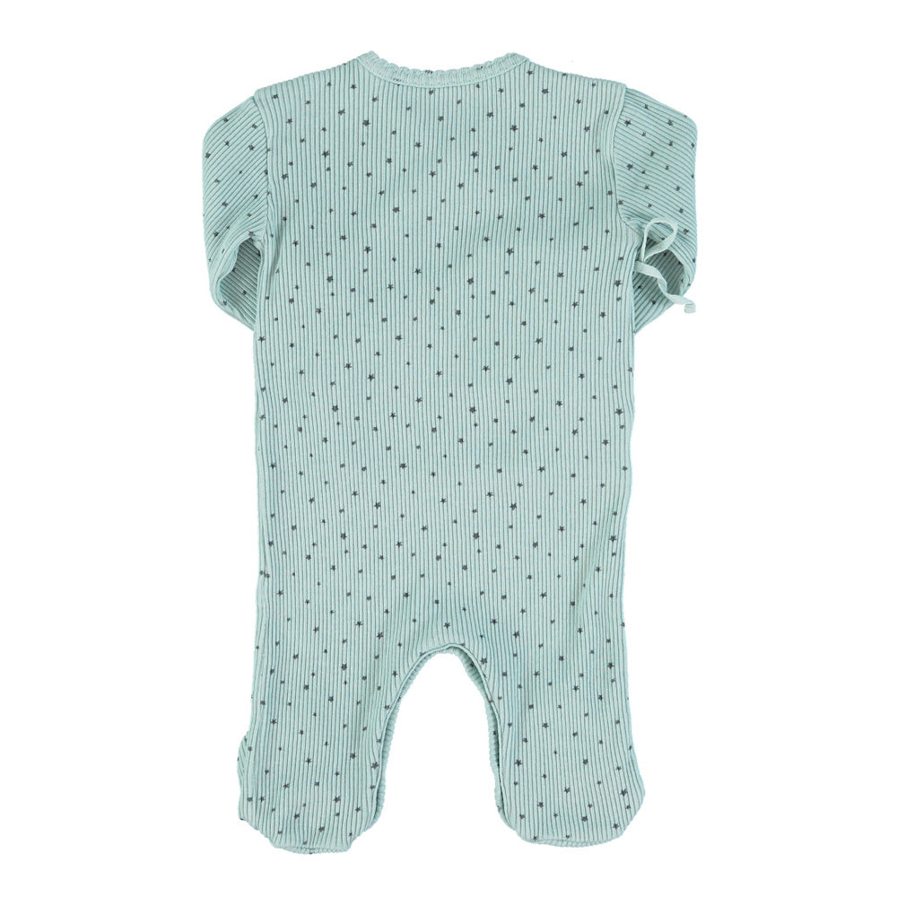 Newborn babygrow tightened at the wrists. Press studos between legs for easy opening. Integrated feet.