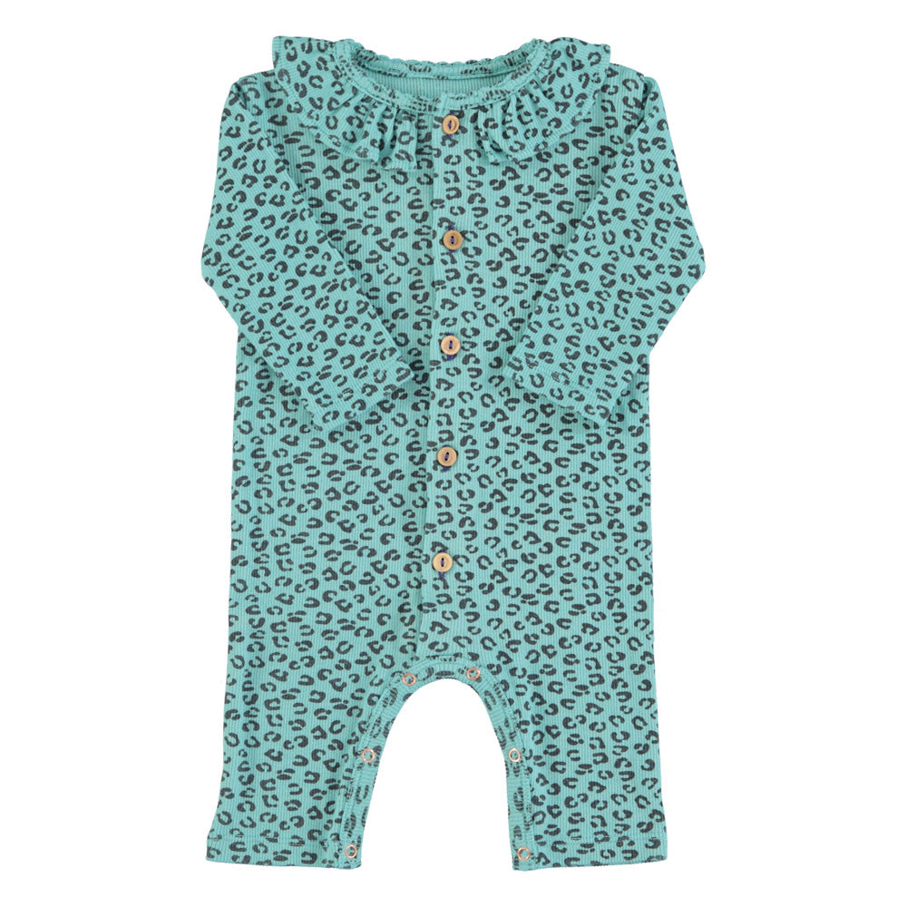 Newborn long sleeve babygrow with collar in ribbed jersey. Press-studs at the legs for easy opening. Detailed with wood buttons on the front.