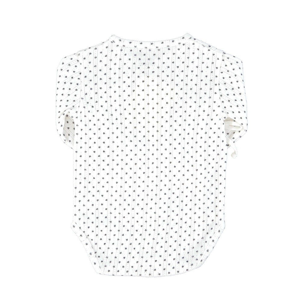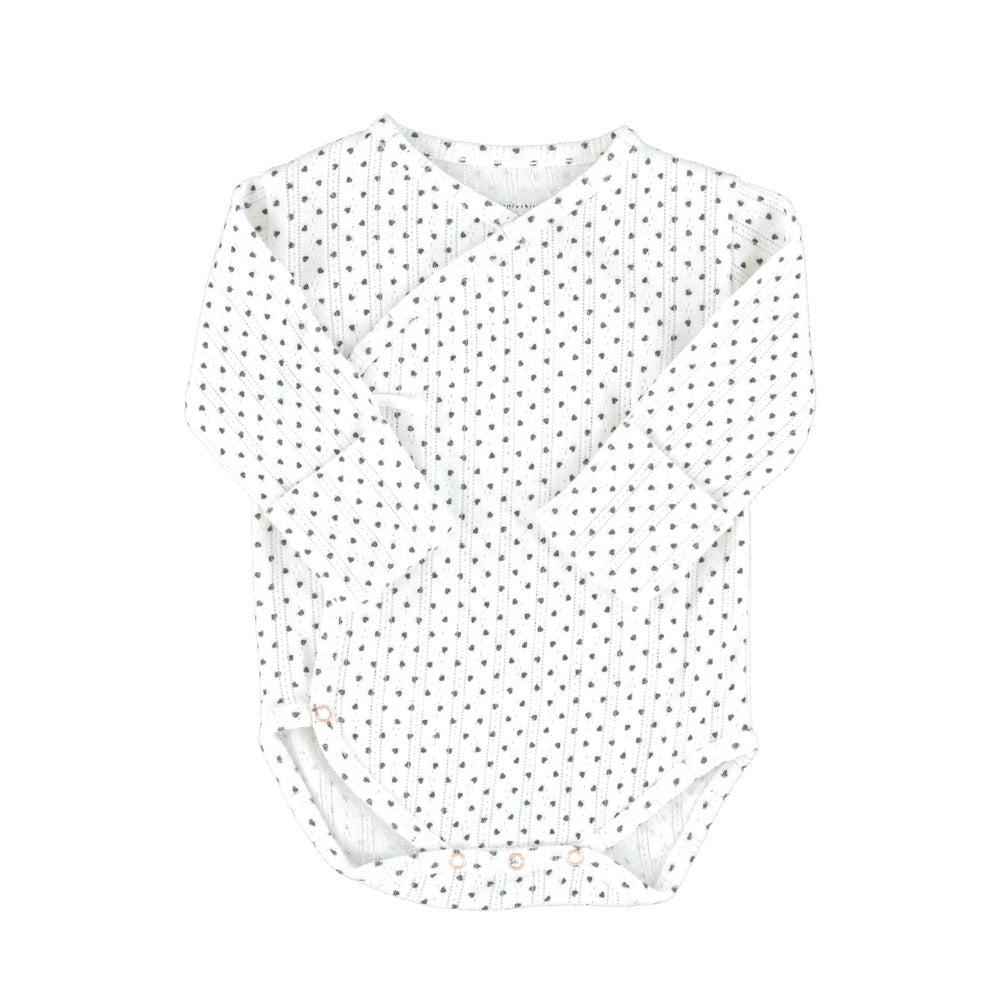 Newborn bodysuit in organic cotton. Wrap-over neckline, top stitched, long sleeves, raglan sleeve, tightened at the wrists, press studs at the crotch for easy opening.