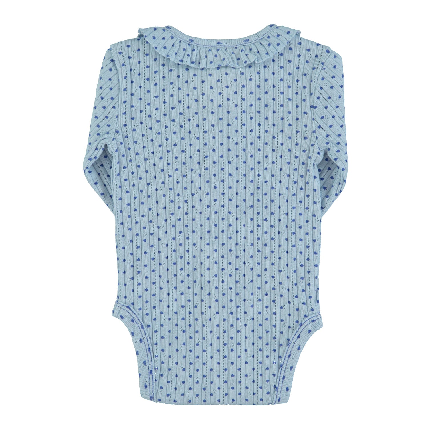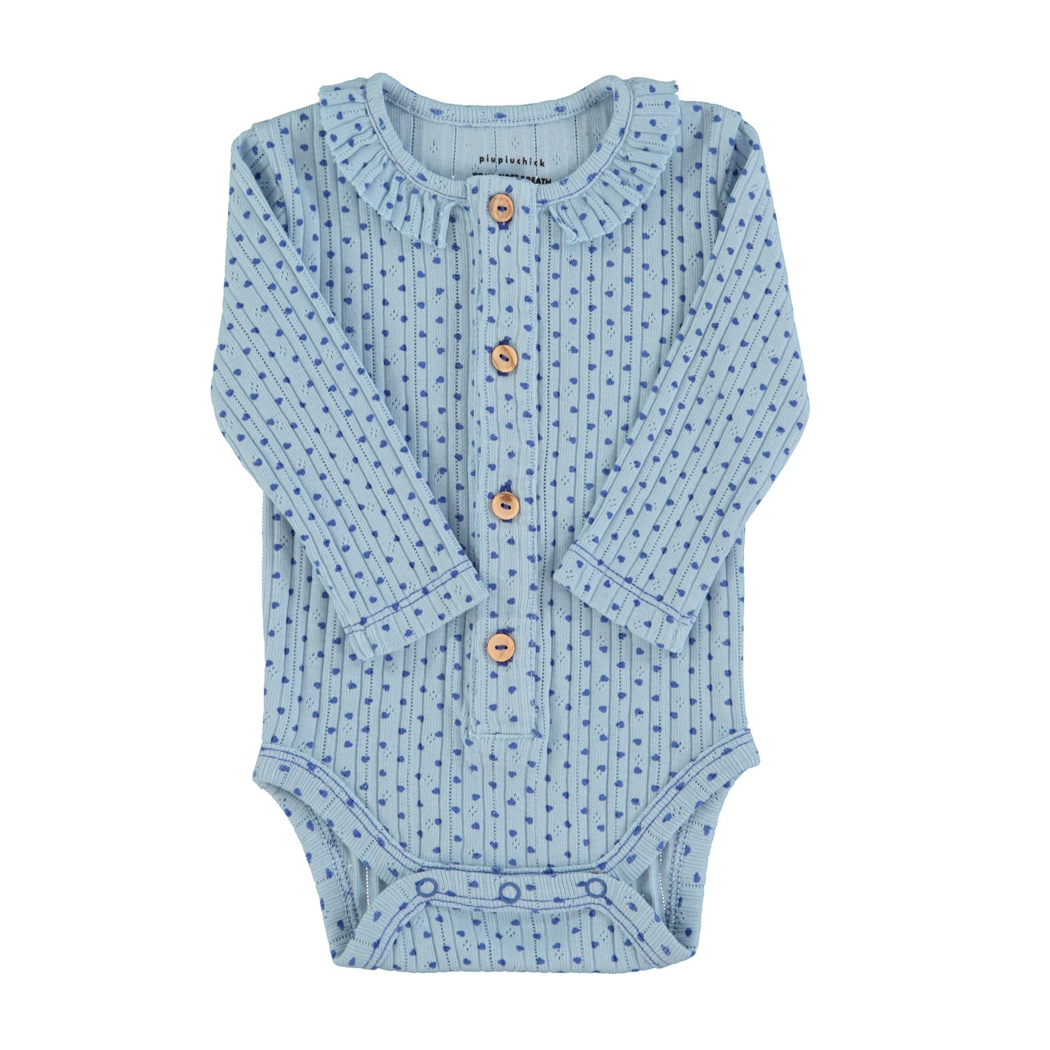 Long sleeve bodysuit in ribbed jacquard with little collar. Fasteners at the crotch for easy opening. Detailed with wood buttons on the front.