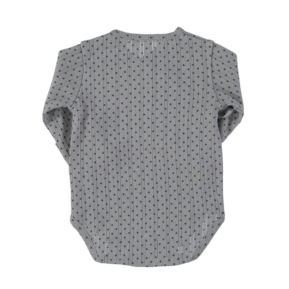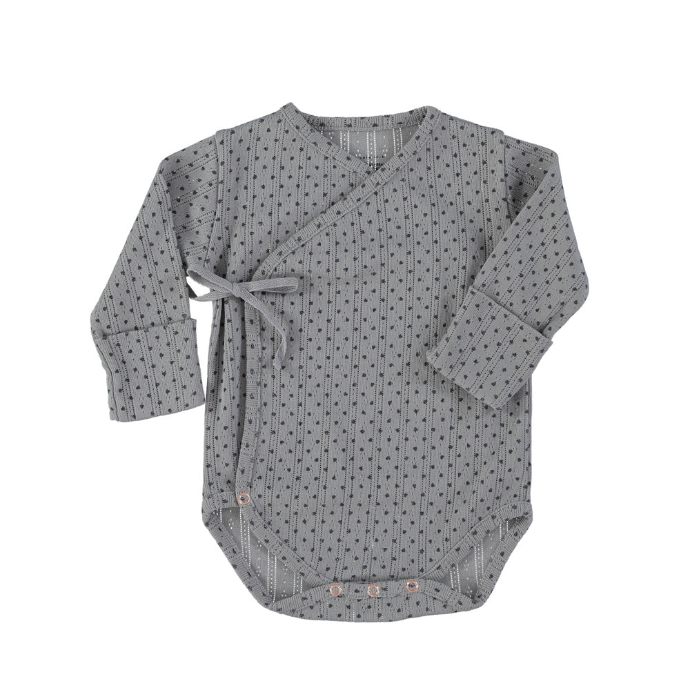 Newborn bodysuit in organic cotton. Wrap-over neckline, top stitched, long sleeves, raglan sleeve, tightened at the wrists, press studs at the crotch for easy opening.