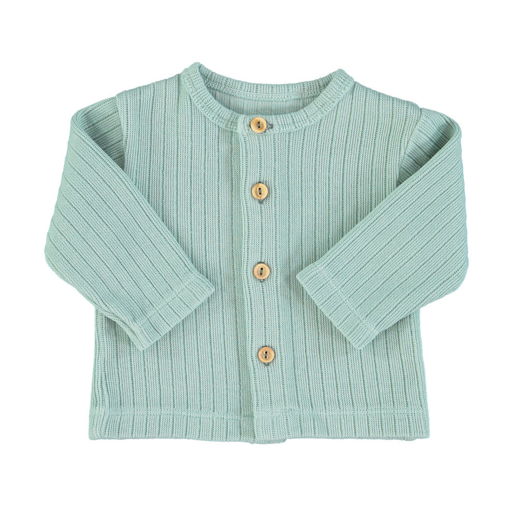Newborn cardigan with wood buttons in the front.