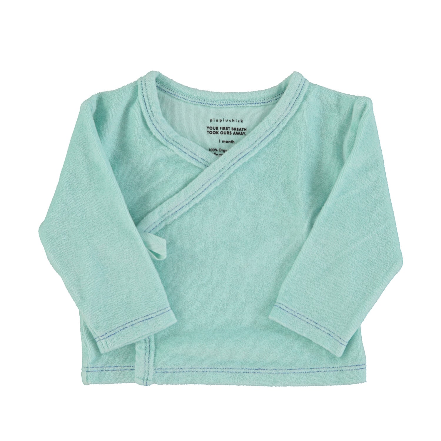 Newborn cardigan in terry cotton. Crossover neckline with small ribbon to adjust.