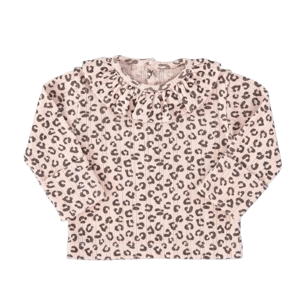 Newborn shirt with frilled collar. Wood buttons in the back.