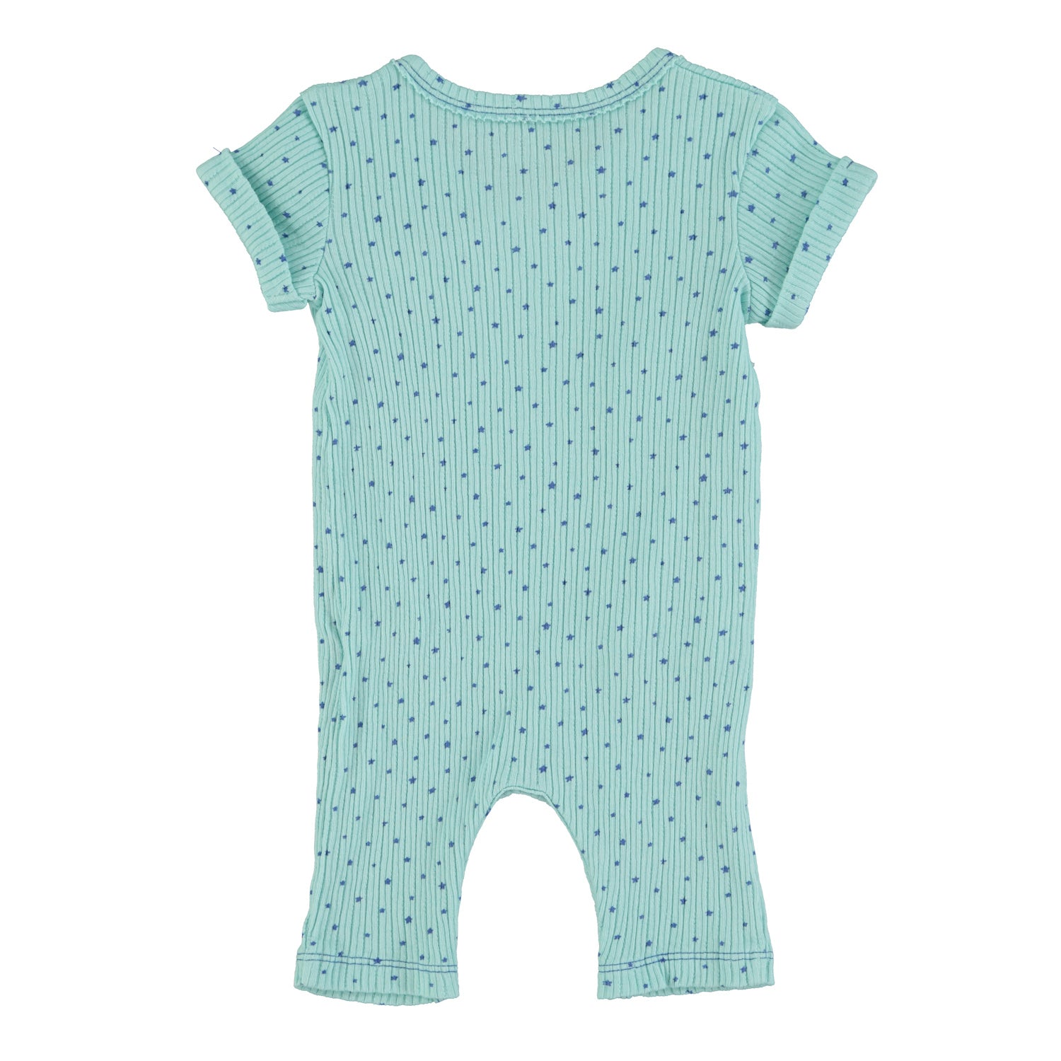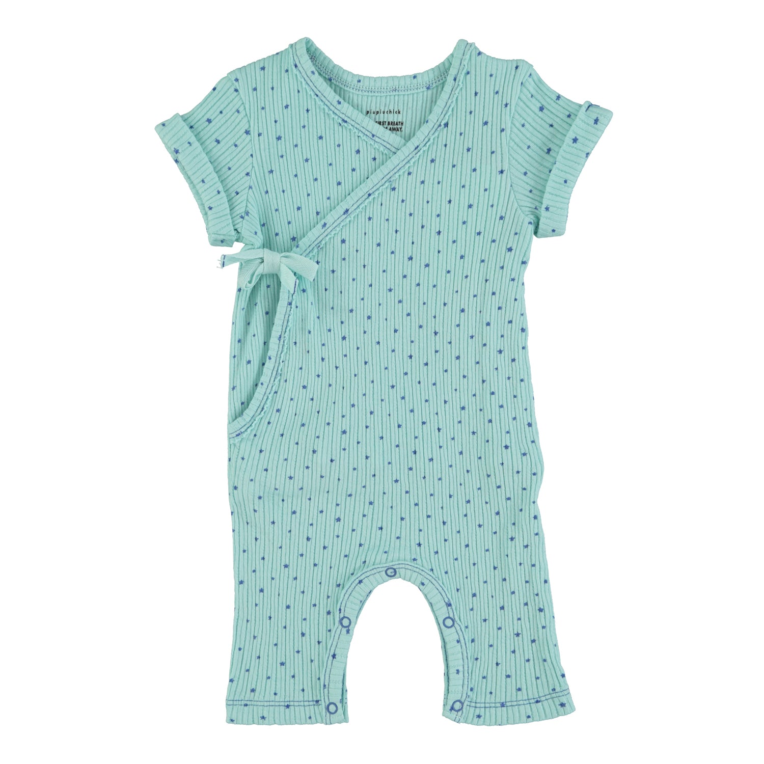 Newborn short sleeve babygrow in ribbed jersey. Crossover neckline with a small ribbon to adjust. Press-studs at the legs for easy opening.