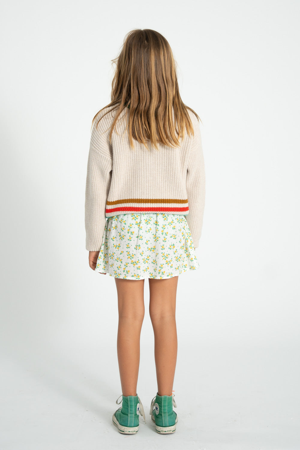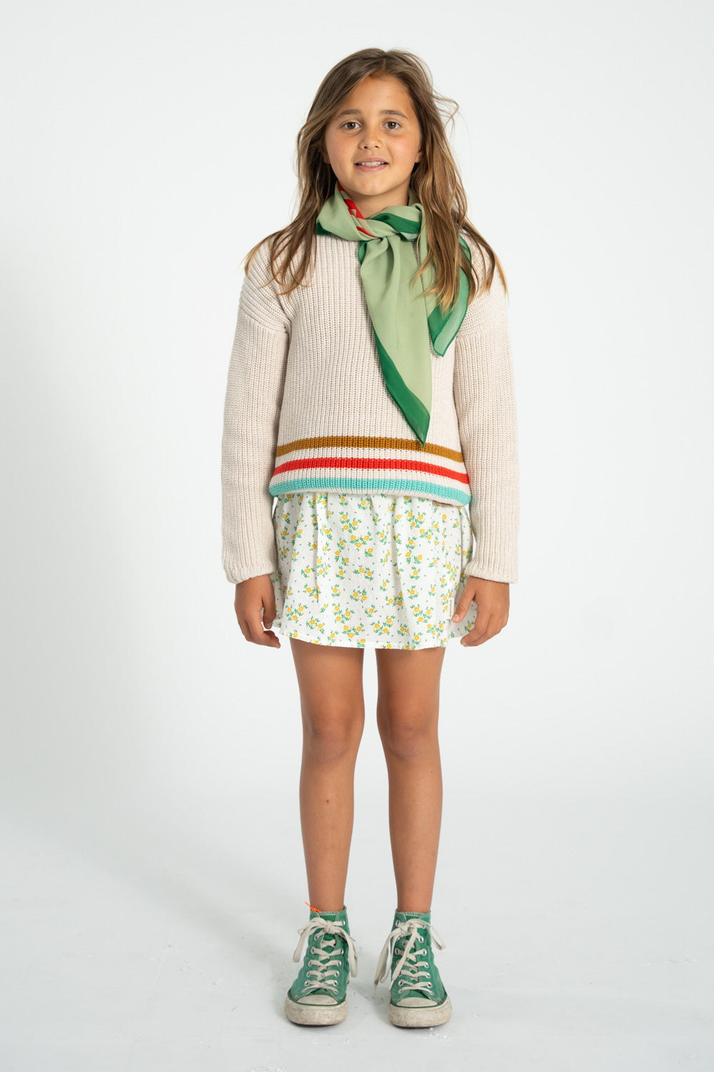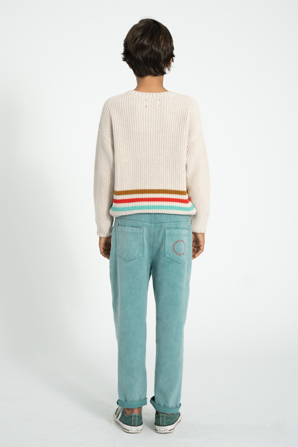 Knitted sweater with rib endings and multicolor stripes on the waist. Detailed with leather logo label. Buttons on shoulder for baby sizes.