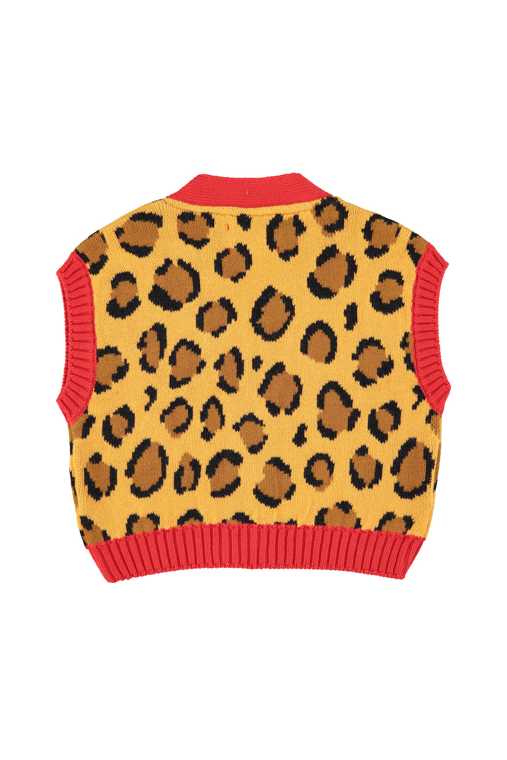 Knitted waistcoat with a V-neckline and ribbed edges. Detailed with wood button panel and leather logo.