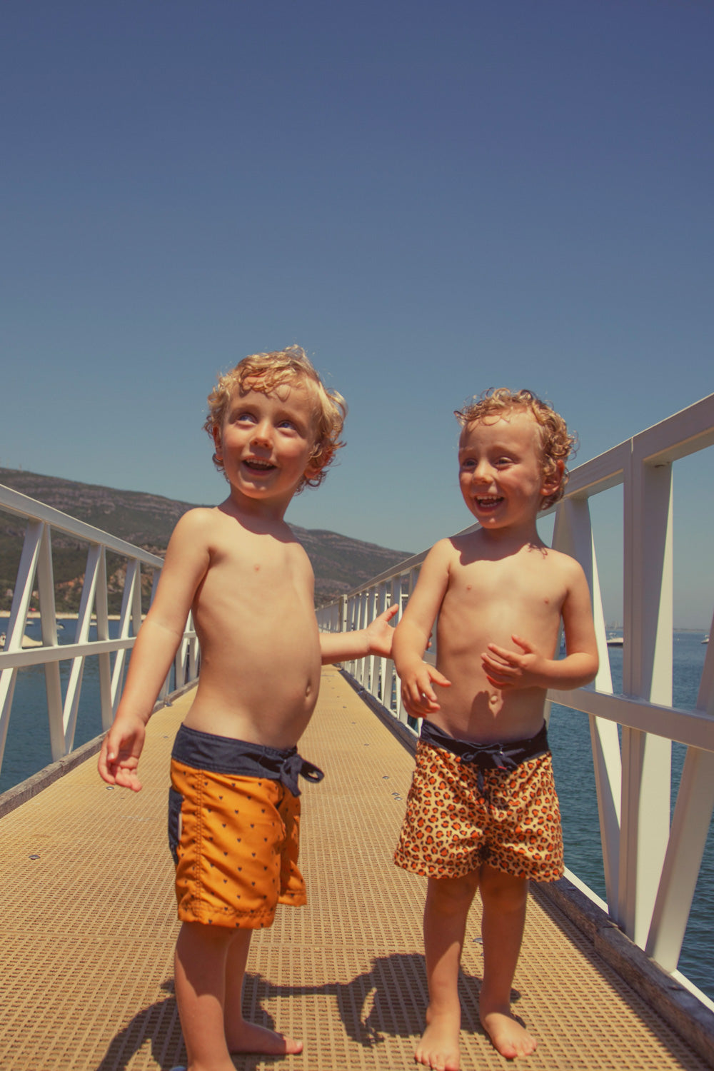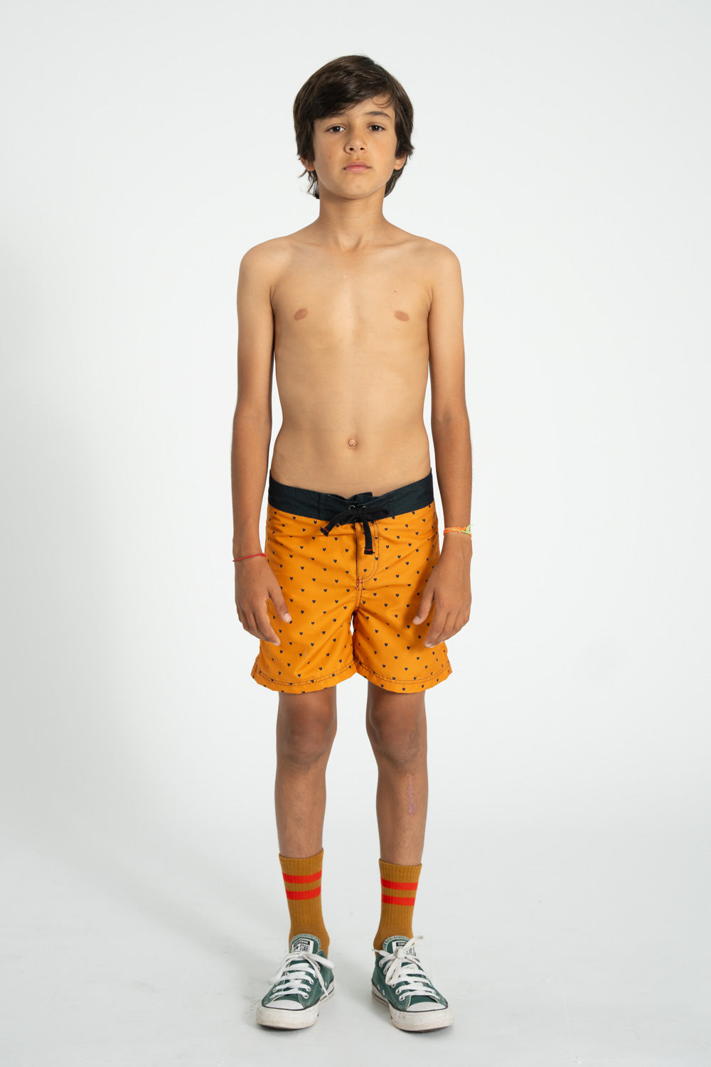 Swim shorts with a hook and loop fastening and adjustable drawstrings.
