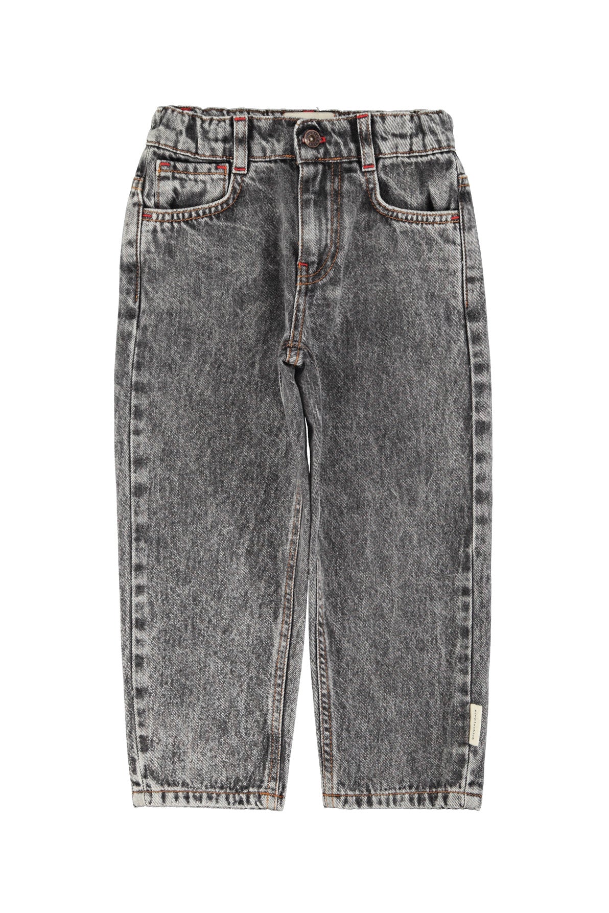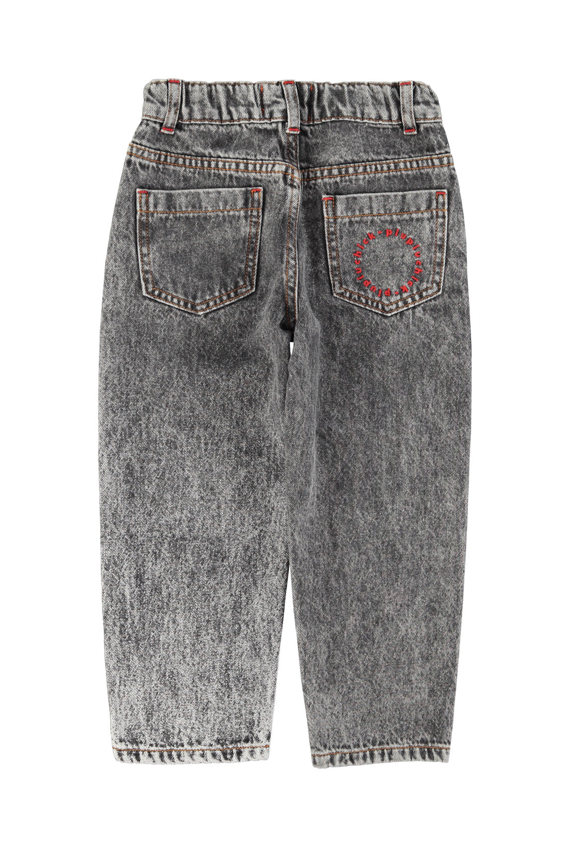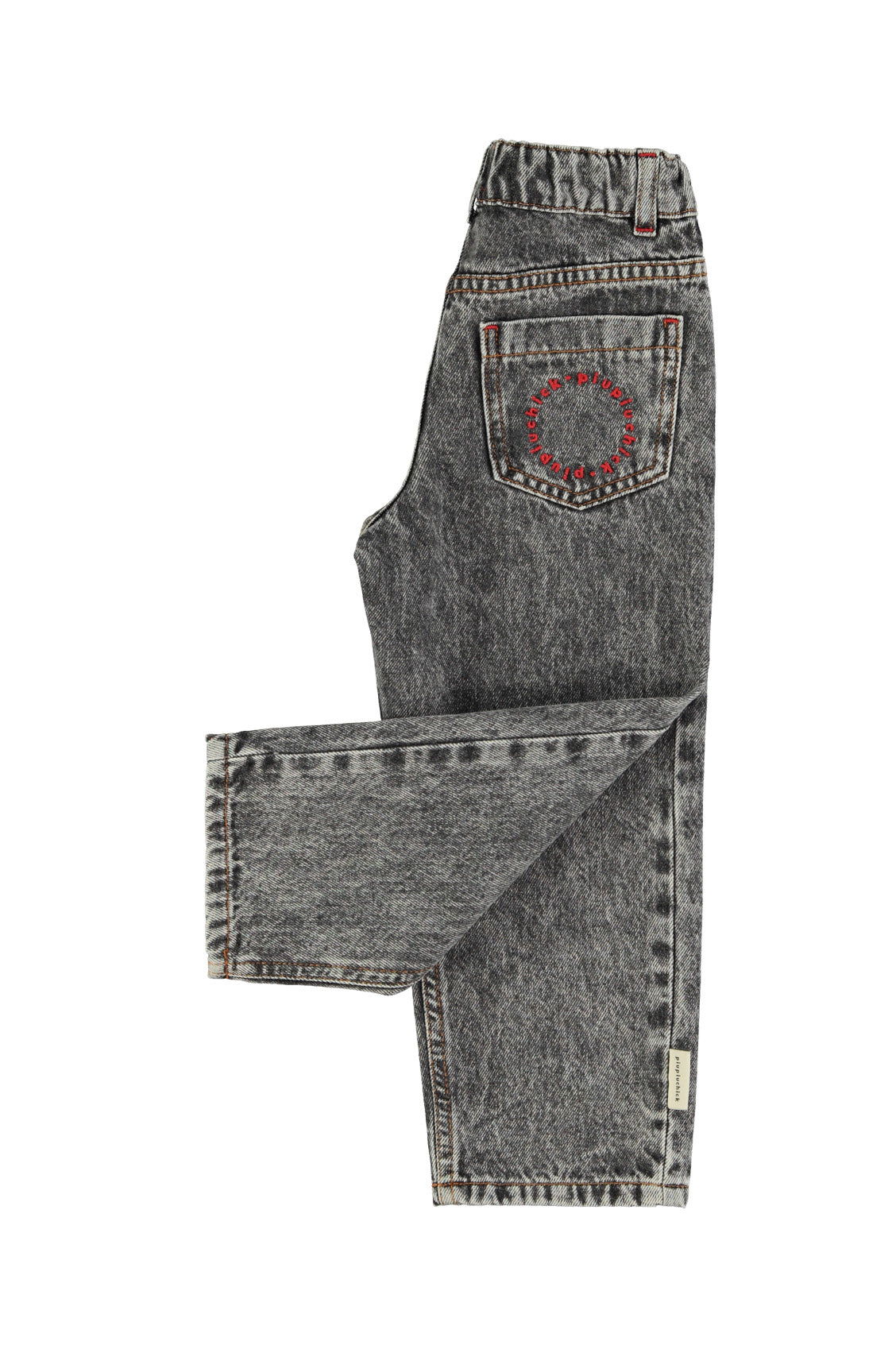 Unisex washed denim trousers with adjustable waist. Detailed with red logo embroidery in one back pocket.