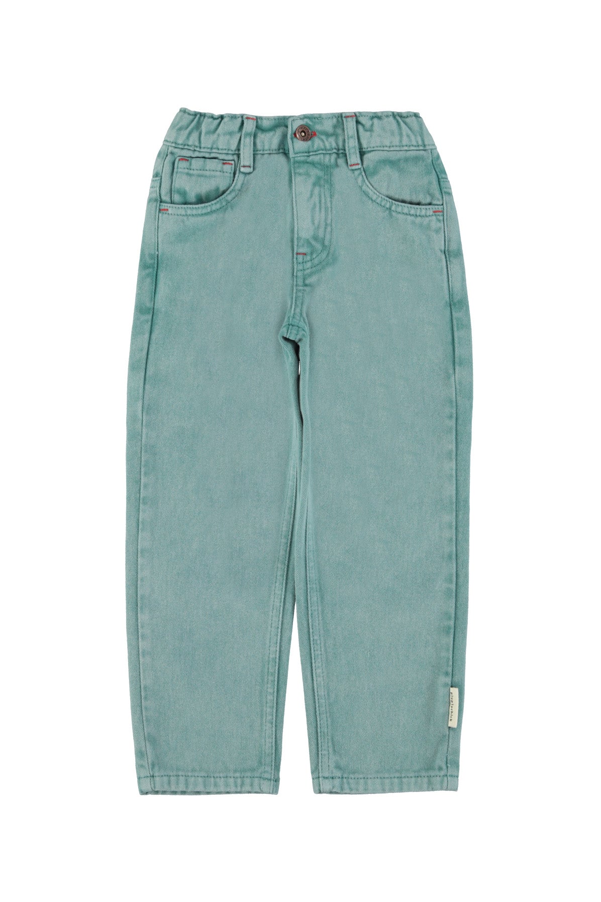 Unisex washed denim trousers with adjustable waist. Detailed with red logo embroidery in one back pocket.