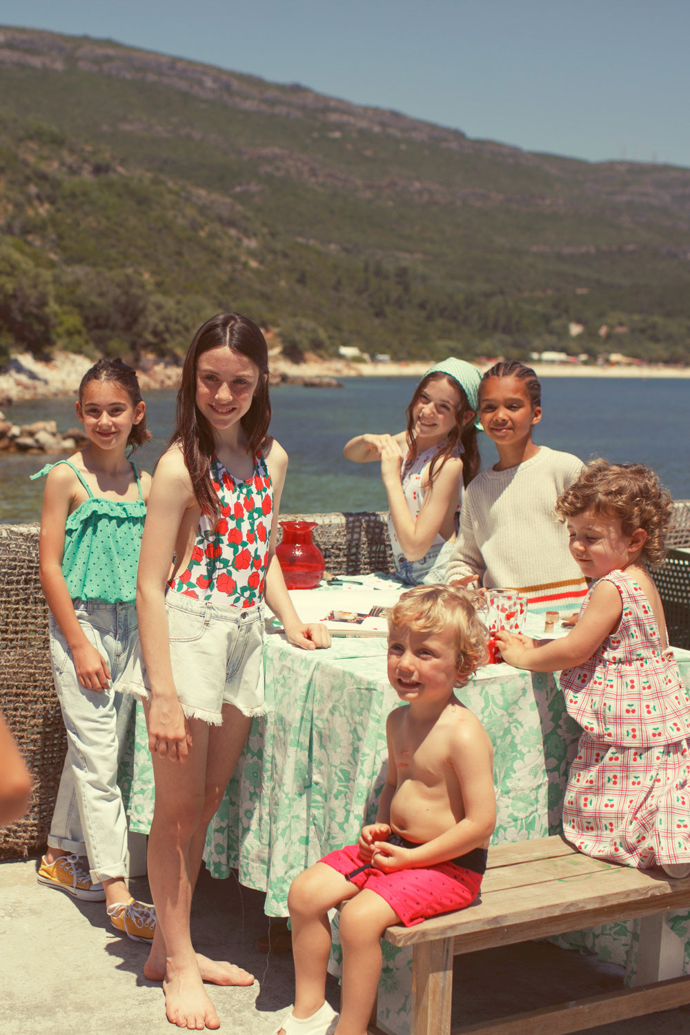 Shorts loose fit with fringe ending and adjustable elastic waist. Detailed with red logo embroidery in one back pocket.