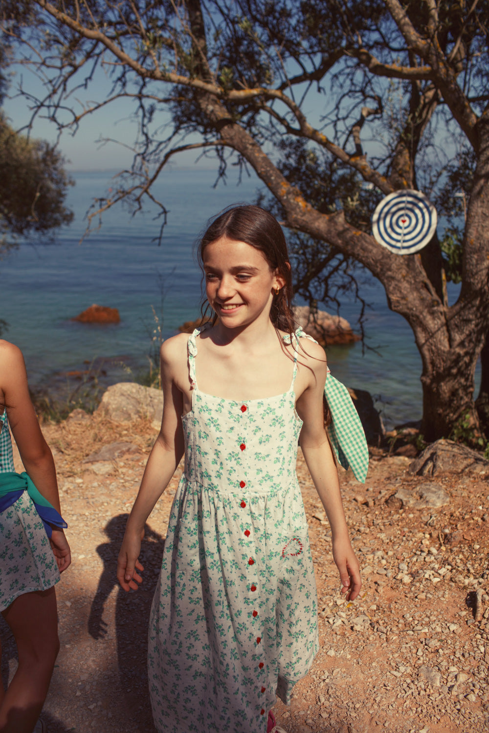 Long dress with thin shoulder tie up straps and patch pockets. Detailed with red logo embroidery in one pocket. Red buttons on the front.