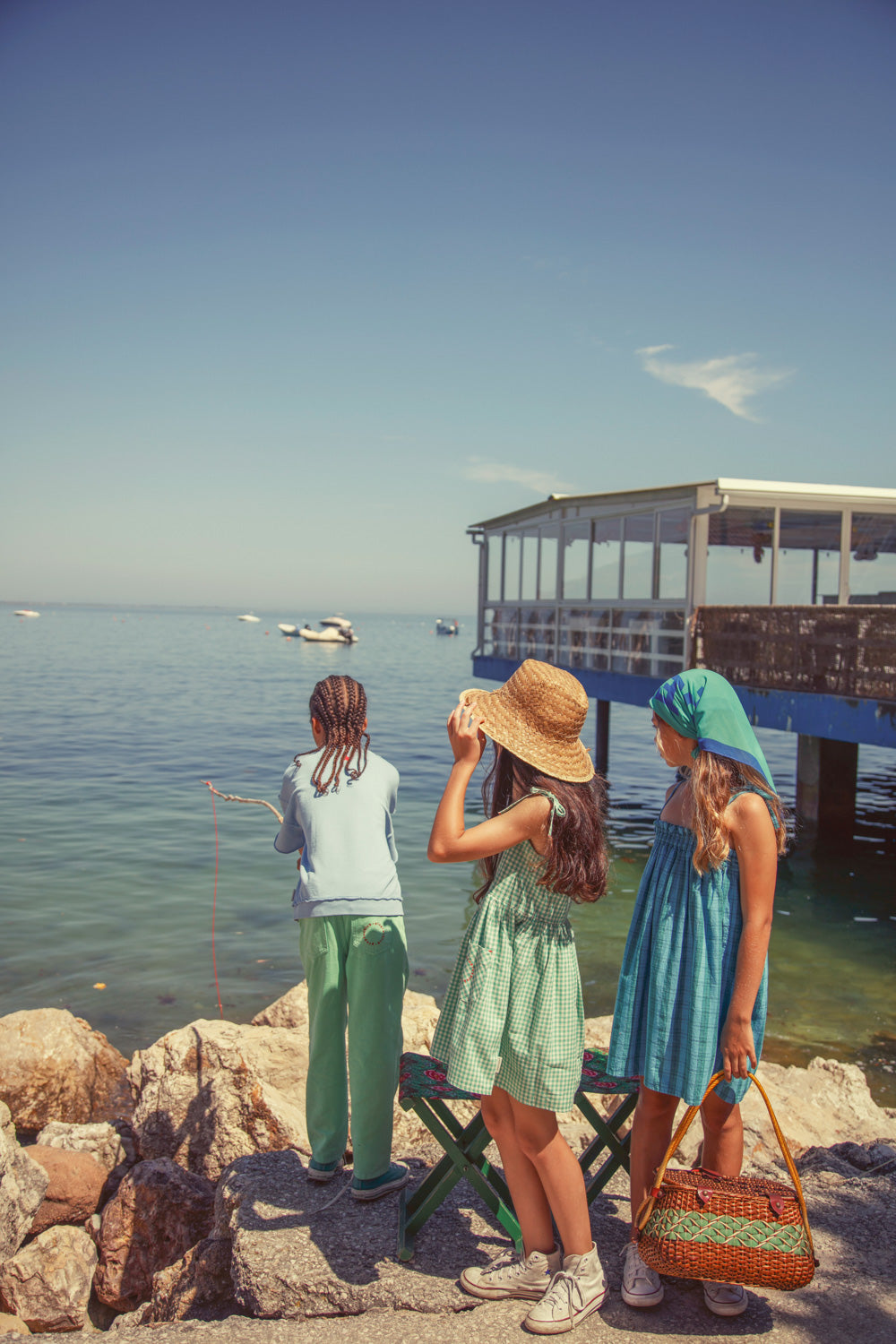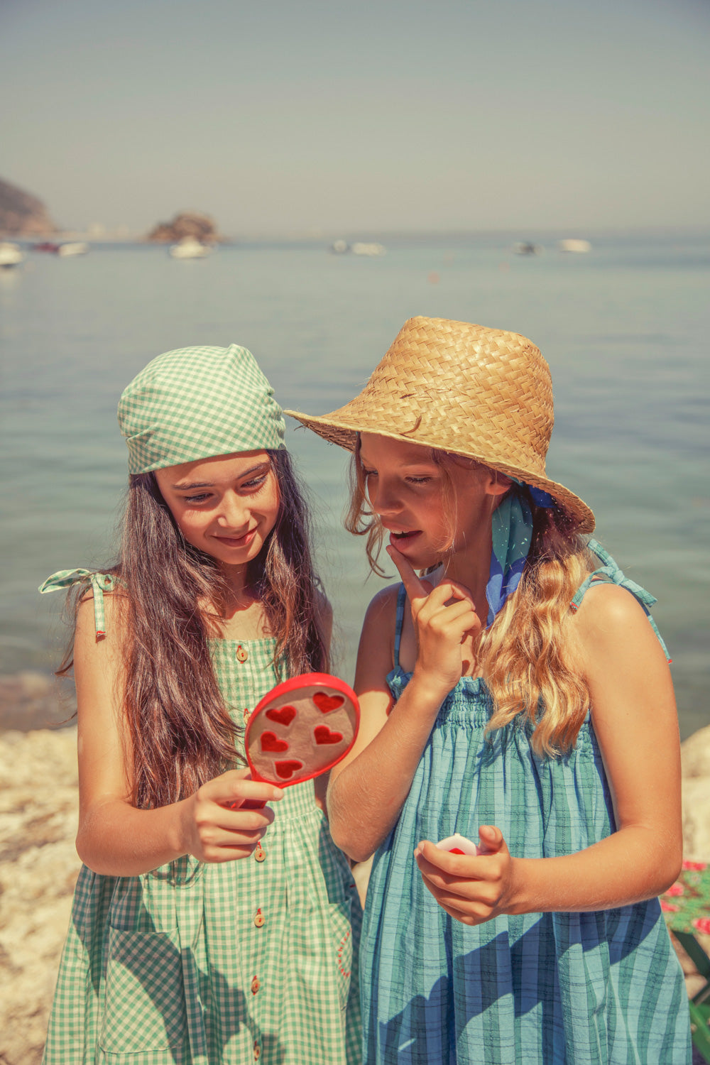 Short dress with thin shoulder tie up straps and patch pockets, one with a red embroidered logo. Wood buttons on the front.