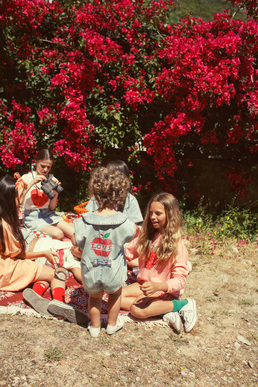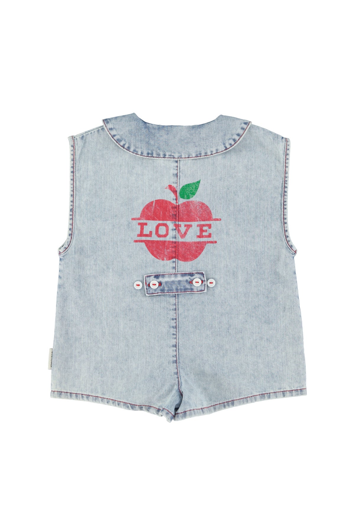 Short sleeveless jumpsuit with round collar. Two front patch pockets. Front white buttons. Detailed with back print and a little belt to better fit.