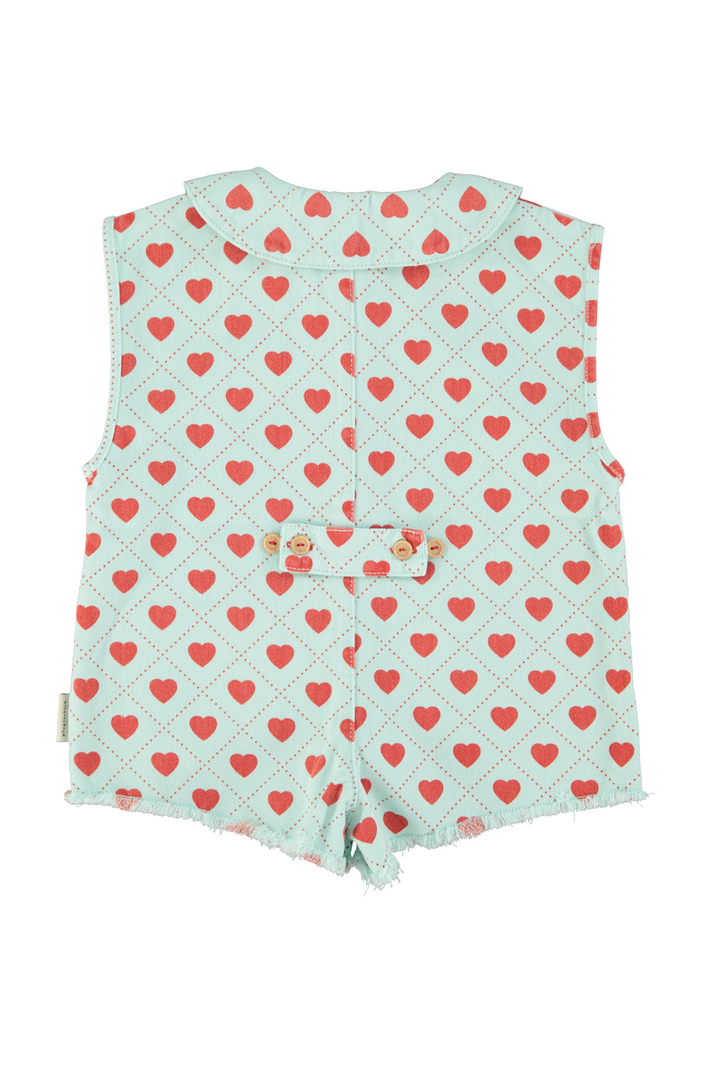 Short sleeveless jumpsuit with round collar and fringe ending. Two front patch pockets. Front wood buttons. Detailed with little belt on back to better fit.