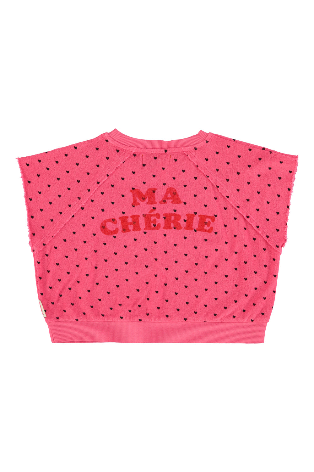Sleeveless sweatshirt in terry cotton detailed with black hearts allover. Front and back prints and ribbed hems. Red buttons on shoulder for baby sizes.
