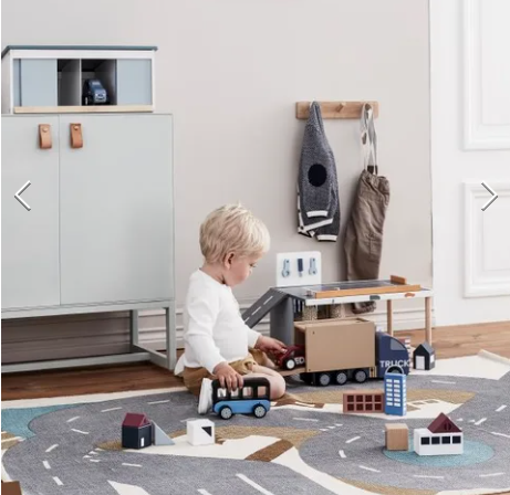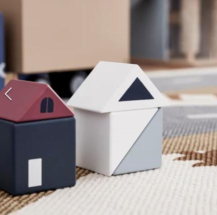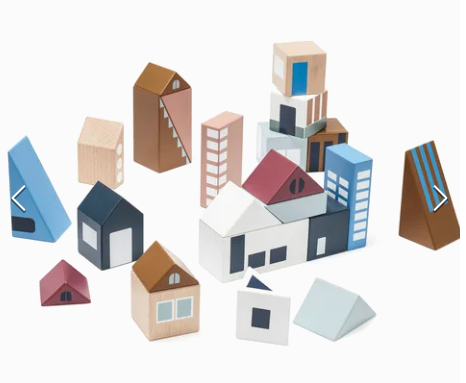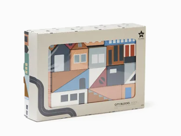 Use your imagination to build your own city with these cute wooden blocks. Apartment blocks, factories, bridges and many kind of buildings that shapes a city. Various multi-coloured shapes, patterns, and sizes to help recreate any city look. Fits perfect to our Aiden City play rug.