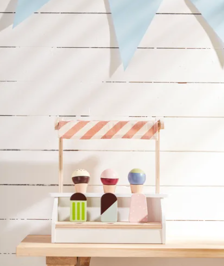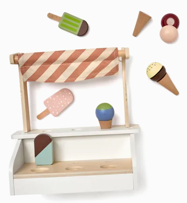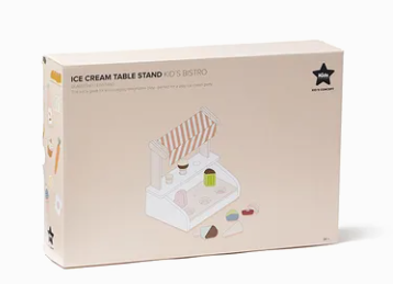 Ice cream table stand: Linden plywood. Cone, stick ice lolly: Beech. Ice cream: Schima. Textile: Cotton.