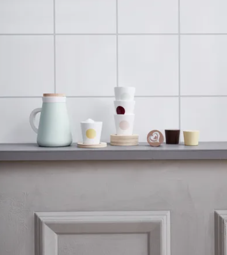 Thermos: Pine. Cups, beverage block: Schima. Coaster: Linden wood.