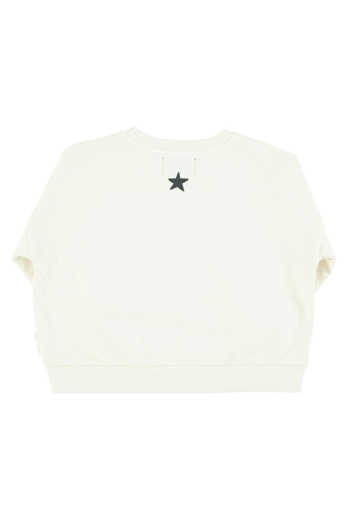 Unisex sweatshirt with frontal print and a little black logo star at back. Seam details. Carded organic cotton fleece. Ribbed cufs. Baby sizes have buttons on the shoulders.